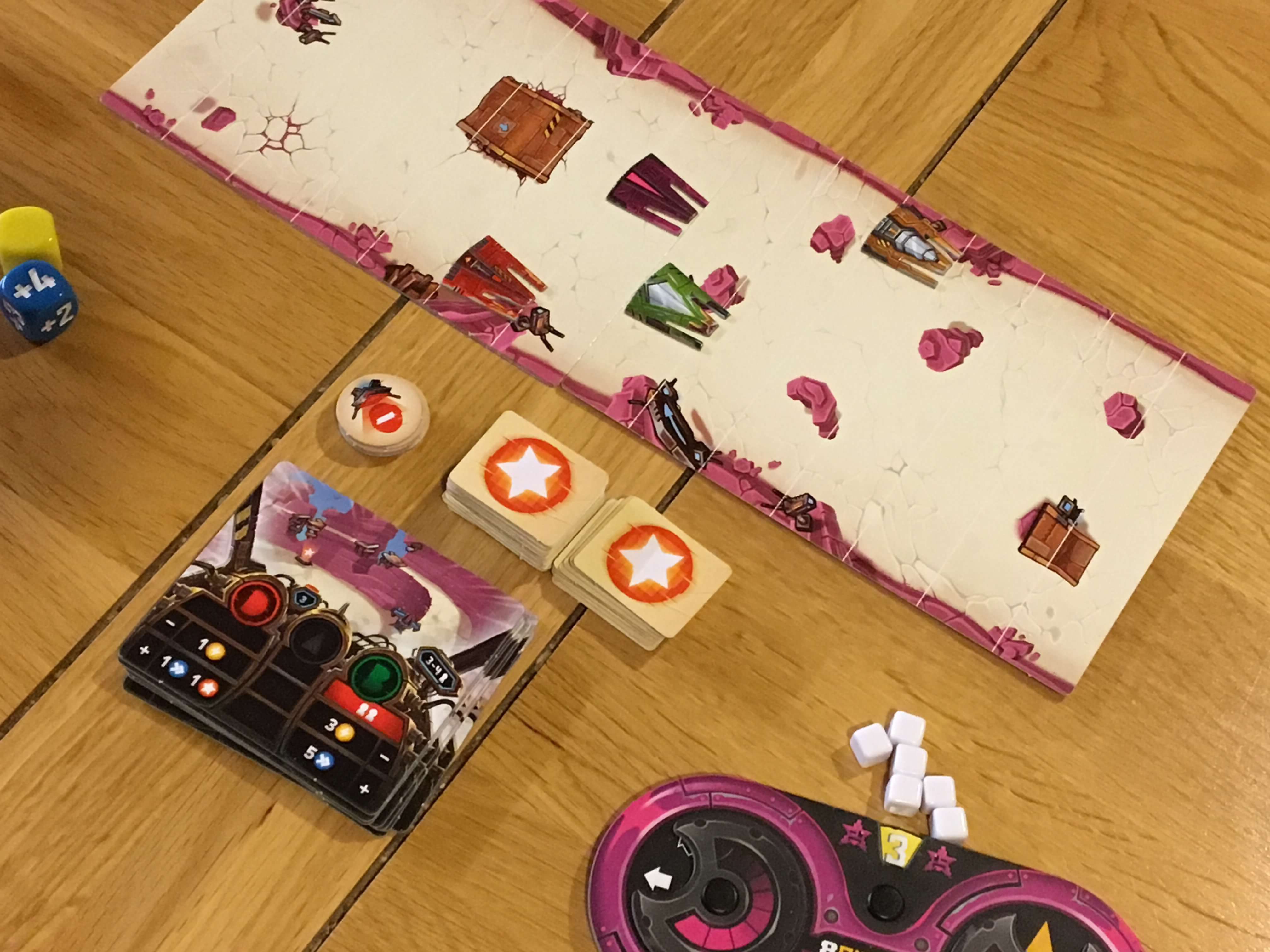 Again, whilst each of the games in 8Bit Box is linked by the programmatic nature of the controllers around which they centre, there is a different feel from one game to the next. Pixoid, for example, is the most classically simple game in the set and it is probably the fastest game to pick up and have fun with, but Stadium introduces a lot of variety across the games within it – some of which last literally a minute or two including teaching. Outspeed is slightly heavier than the other games and uses a mechanism that is similar to Pixoid to program movement, whilst also sharing the energy (or in this case fuel) management of Stadium. Where it brings its own ideas and additional complexity are really seen in how the track builds out randomly and because it’s the only game to feature off-board elements in the form of power up tokens.