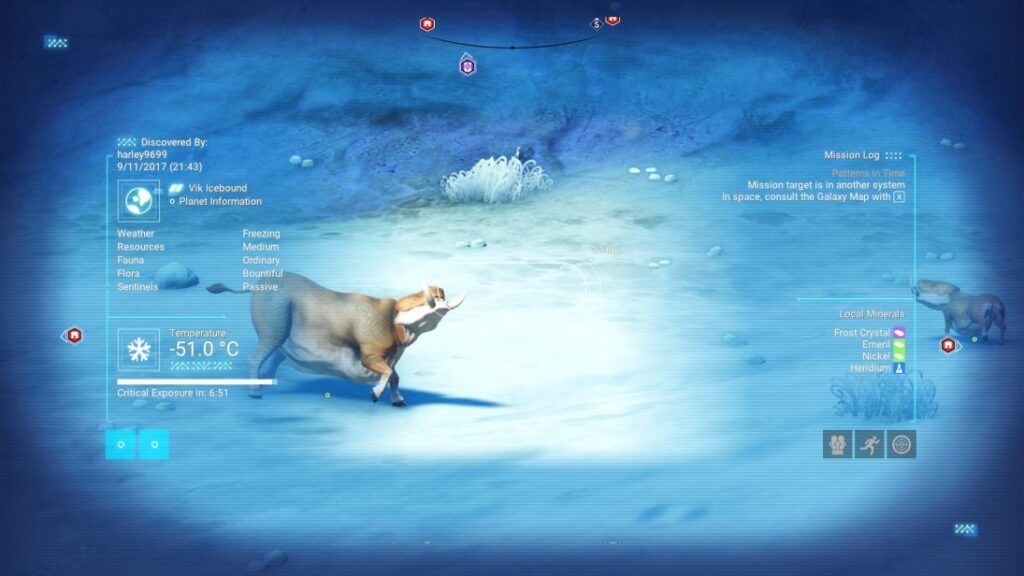 During the game, you have to work your way up through a sort of tech tree, while also finding recipes. Once I finally got the ability to build and use Exocraft (a type of vehicle which comes in three different models/varieties), I was extremely excited. It was also very pleasant to have a different mode of transportation. Additionally, a huge number of planets I’ve visited typically have inhospitable atmospheres, but while inside the Exocraft I am immune from those bad air quality effects. This lets me move a lot farther and not have to take cover every few minutes as I do while walking or running.