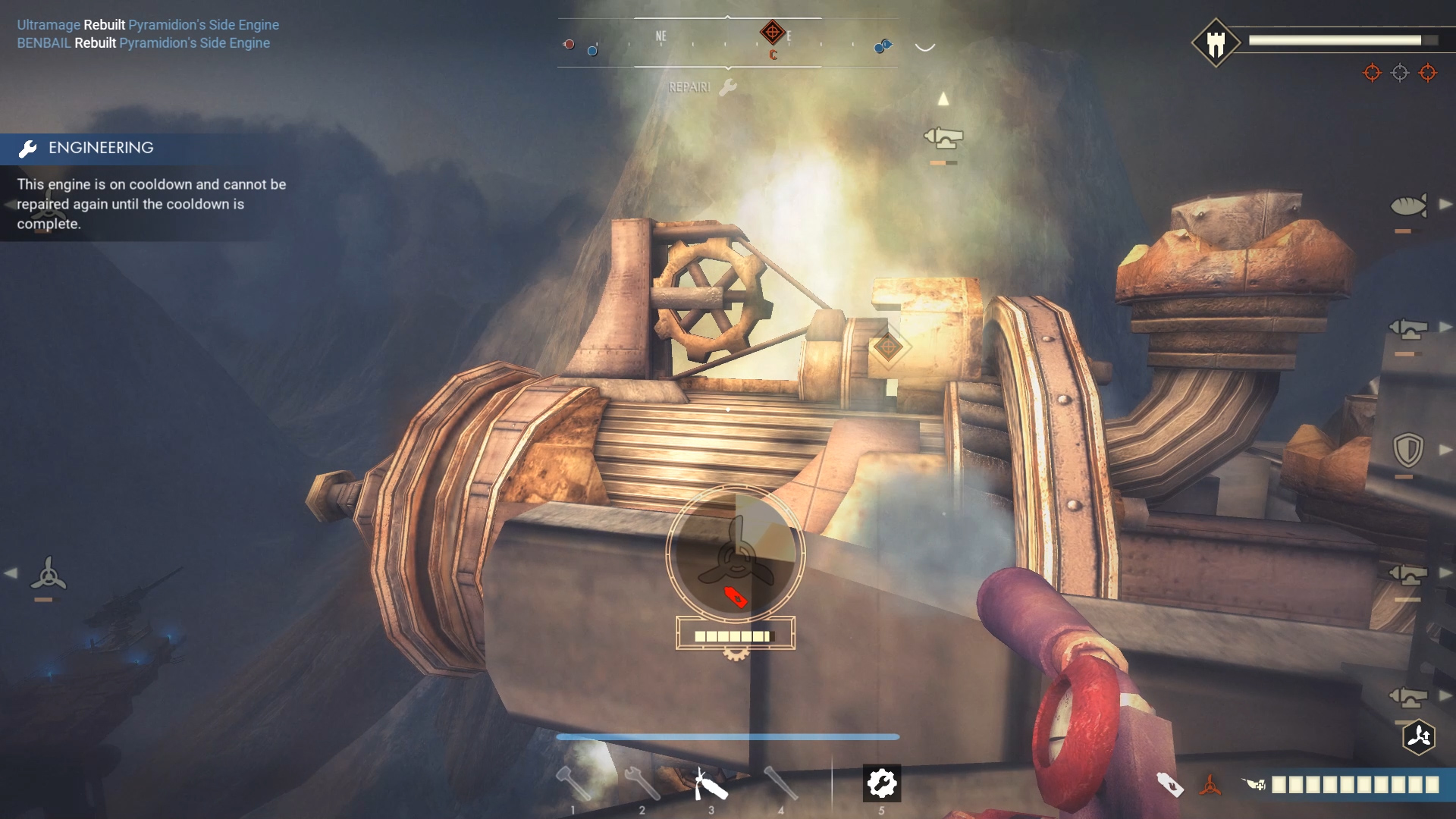 Everyone has a role, and the match won’t be won if a player is acting as a solo war hero, the Pilot needs help knowing where enemy ships are, they also need to instruct the Gunners where their targets are and in doing so must position the ship so the best guns for the job get it done. The Gunners don’t carry much in terms of tools as most of their time should really be spent on the guns. Should their guns take damage and an engineer is busy repairing the balloon – for example – they can repair it slightly with a repair tool if they choose that during the character load out screen. As for Engineers, their job doesn’t really start until a battle begins. Parts of the ship begin to set alight, and at the same time a gun is being taken down. Engineers need to strategically think on their feet, should they rush to the ship part and quickly fix that and hope to make it to the guns afterwards, or do they keep the guns going and hope the ship doesn’t sink to the Earth. What’s also cool, is that everyone can mount the guns if needed. A Pilot, Gunner, and Engineer can all be mounted on guns while the ship has been locked into a steady cruise through the battlegroun…skies, should I call them battleskies? Makes sense.
