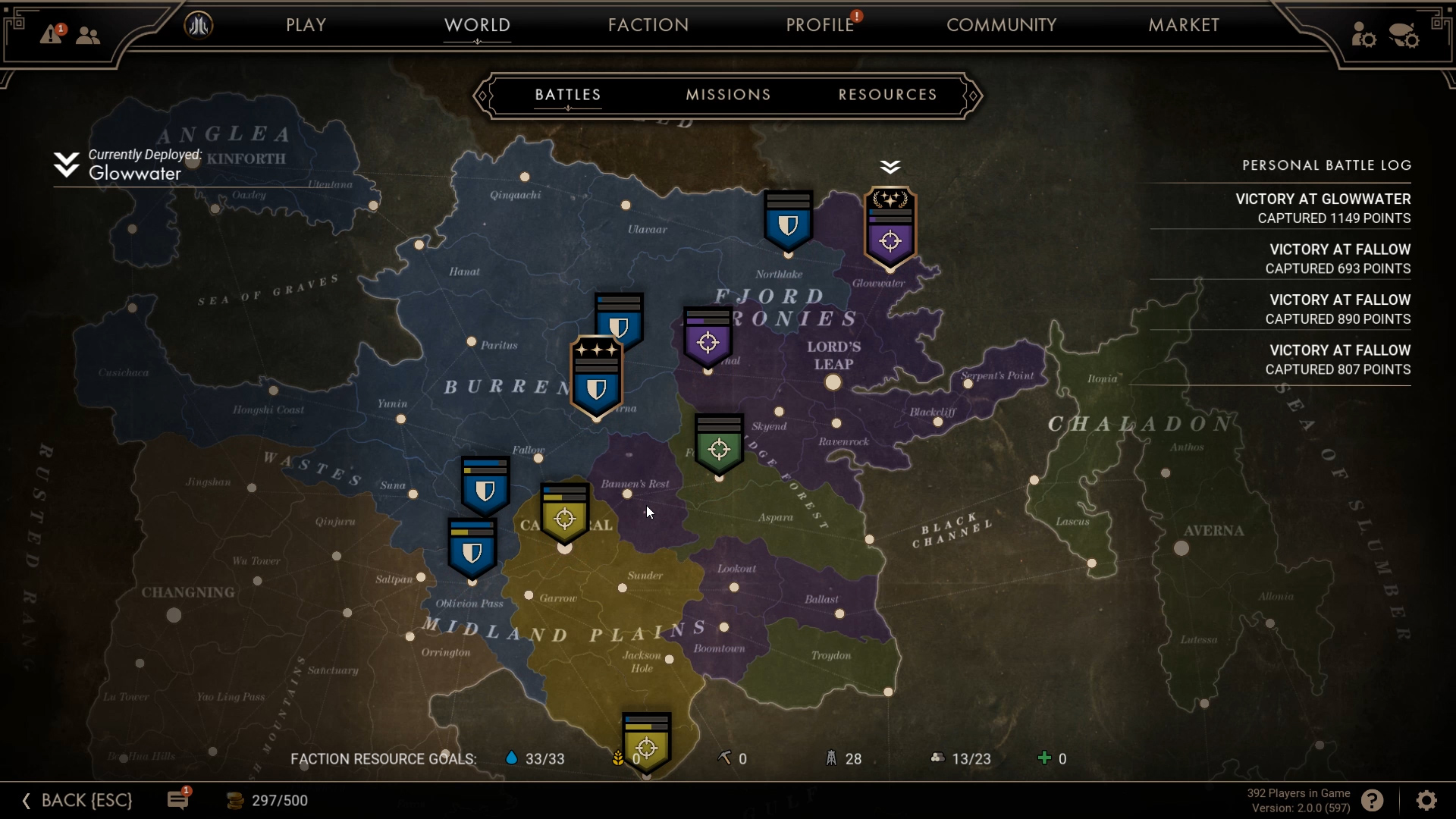 Guns of Icarus: Alliance let’s you see your factions overall, worldwide stats. Allowing you to see what the total number of members within that faction sits at, how many territories have been conquered and lost, how many ships your faction have destroyed, and how many ships your faction have lost. Factions can have a message, and have resource goals, but more on that later. There is a map that shows the types of information you can view. You can view battles that are going on around the world, Missions, in which factions complete missions to gain more resources, and the resources tab shows the available resources around the world.