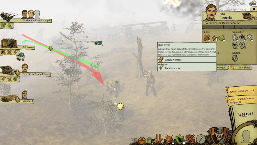 All Quiet in the Trenches is about emotions and controlling the pressure that your units are under, you won’t fail here because you didn’t quite get them into the right type of cover, but you will fail because they find themselves overwhelmed either strategically or emotionally. If they’re stressed then they’ll falter and struggle, and when they’re like that you’ll quickly lose your position. This adds another layer to the juggling act of small-scale skirmishes, even before you take the rather deadly nature of early 1900s trench warfare into consideration.