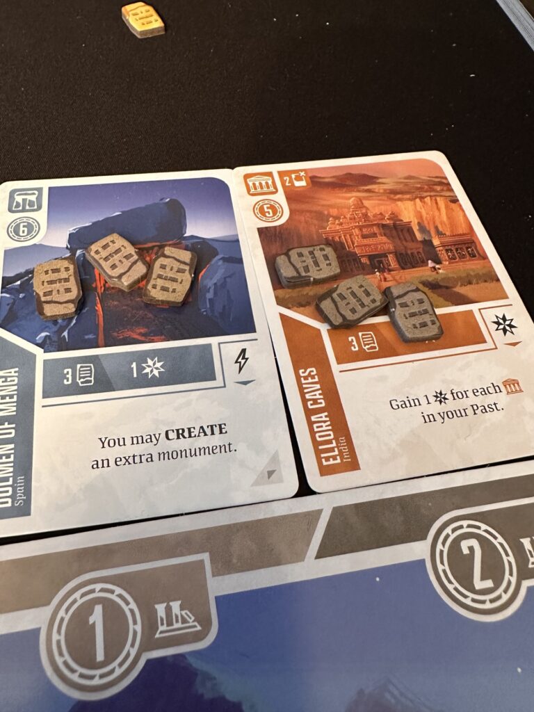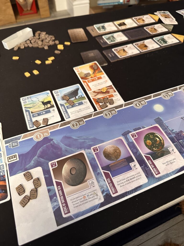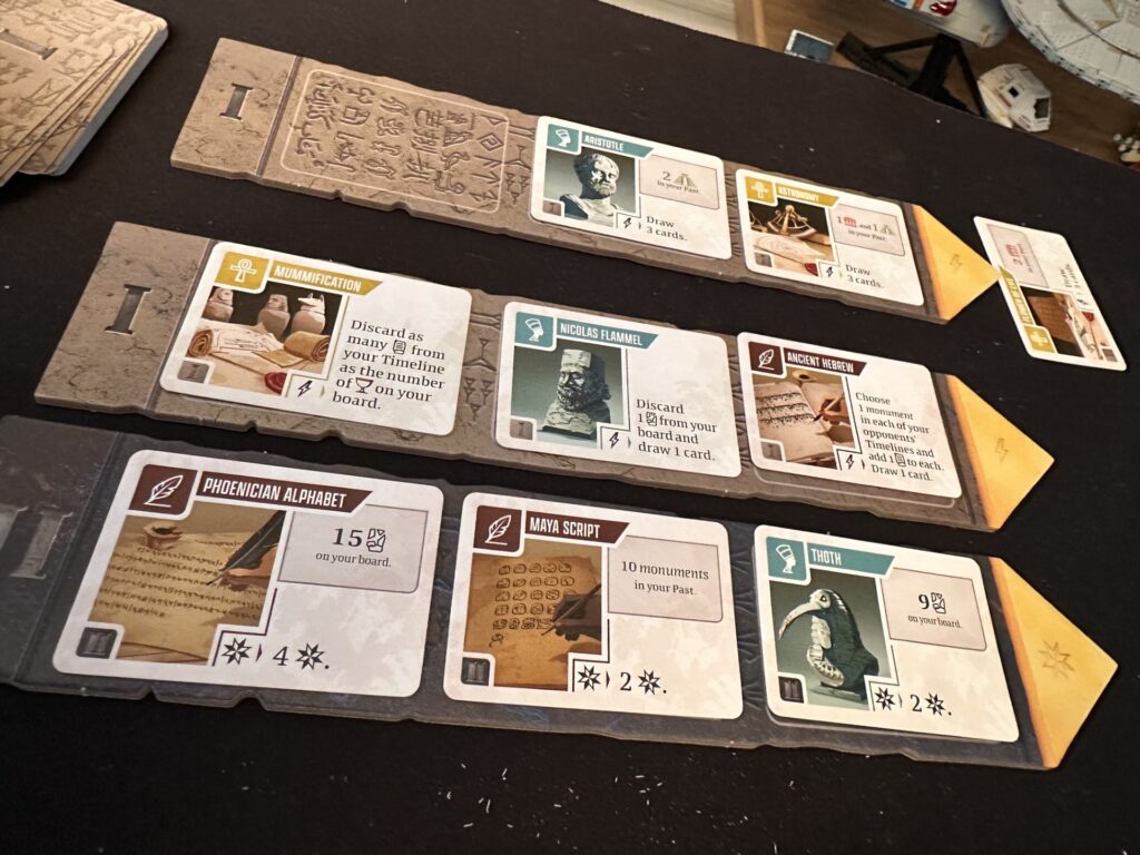 The decay mechanic, in particular, is a brilliant part of the game’s mechanics. I found it intimidating at first, but quickly welcomed it and realised how well it was integrated. Rather than feeling punitive, it encourages long-term planning and clever sequencing. Losing cards hurts — but it’s expected, even necessary, and learning how to soften that blow becomes one of the most satisfying aspects of play. I struggled at first wanting to keep and play every card. But quickly learned that it was ok to sacrifice what looked on the surface like a good scoring card, to play my monument in a higher or lower spot on my timeline. Or to just allow me to play a different card.