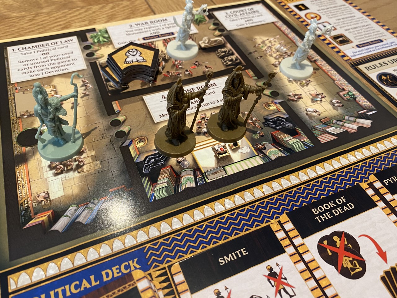 With Ankh: Pharaoh in play, the players must manipulate the Pharaoh – who will begin the game in a space adjacent to a temple held by the last player. They will do this by summoning priests to a new Throne Room board, which includes four spaces. These spaces allow the player summoning the priest to move the Pharaoh, take a politics card (in two different ways) or gain devotion depending on your board presence.