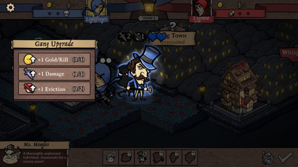This kind of thought process about defending what you have (or not) and expanding your range through scouting and taking over new buildings is another thing I like in Antihero. There’s a genuine feeling of risk and reward to make every decision feel important. If you have three buildings full of urchins but only enough money to place one bomb and one gang, where will you put them? Which will you prioritise? These decisions are made hard because as I said earlier, there is no outright best strategy – money and lanterns are equally important. Other buildings provide bonuses like extra health, reduced cost or similar, and if your plan for the next turn is to floor the board with powered up thugs, maybe your oddfellows club should be your number one priority?