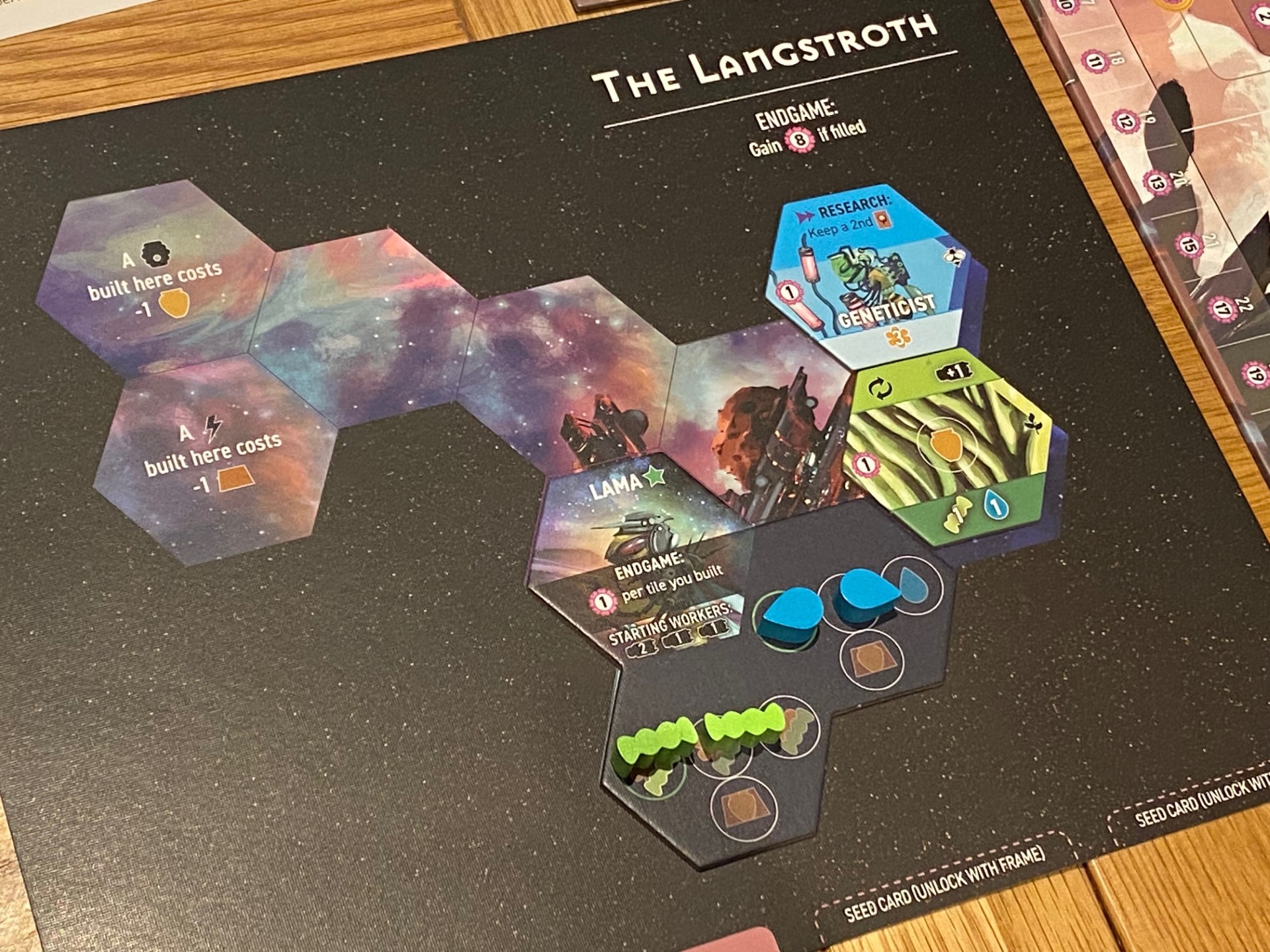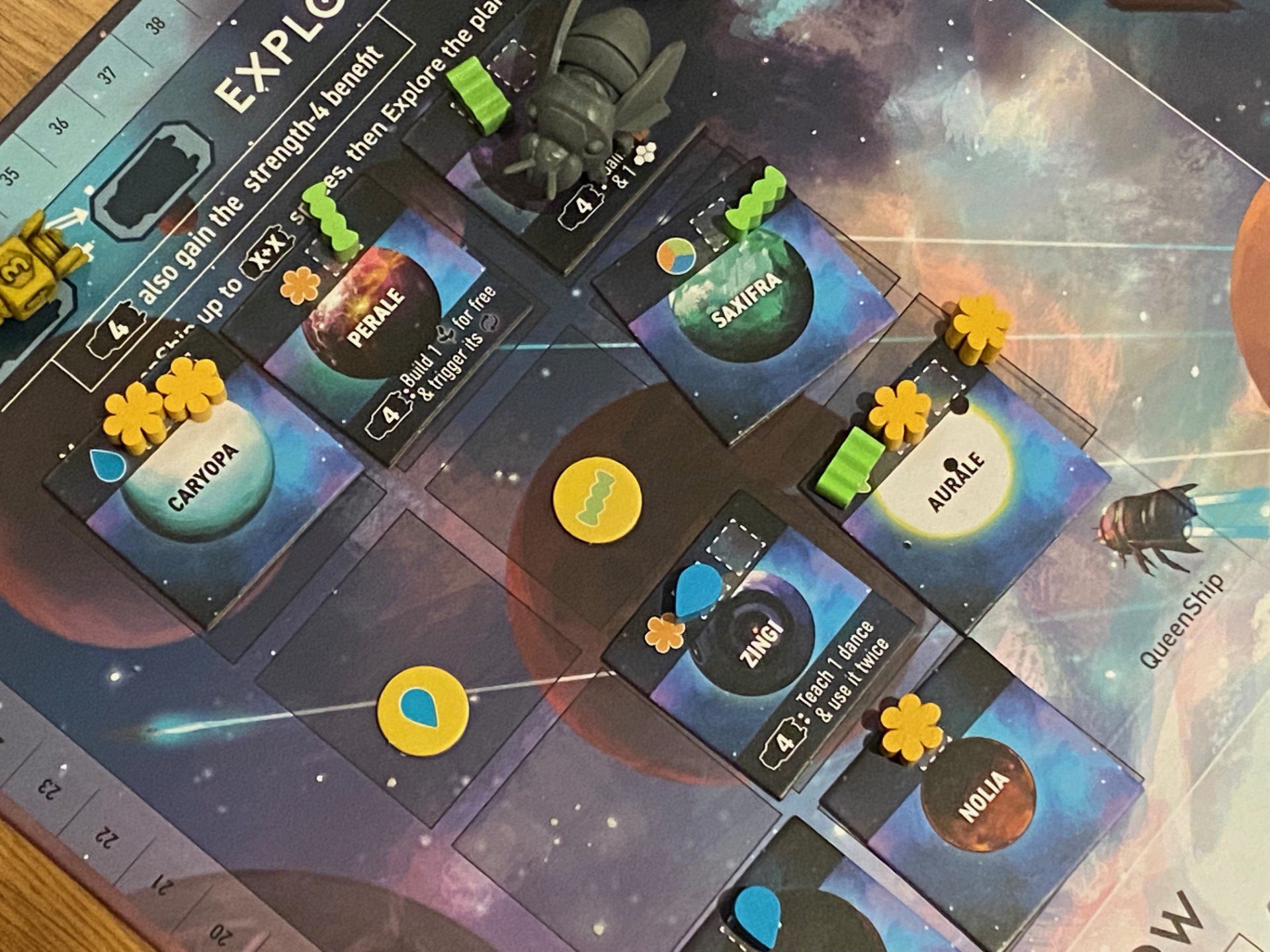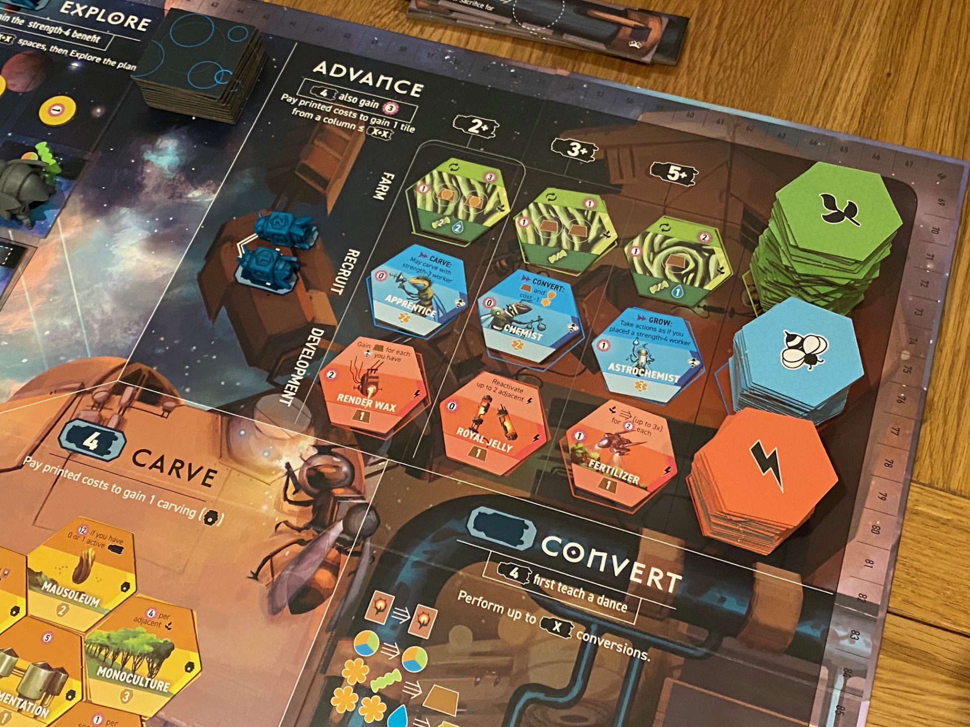 Actions include exploring (by moving the Queen bee and taking resources from the planet it lands on), converting (swapping basic resources or upgrading them to better resources), researching (drawing seed cards), growing (adding new bees or expanding your hive) and advancing (adding new farms, specialists and developments to your hive). There’s also Carving which I have already mentioned, and every action has a special bonus for level four bees that visit. My personal favourite is the convert action bonus, which allows players to teach other bees a Waggle Dance, which adds a completely unique action to the board for others to use.