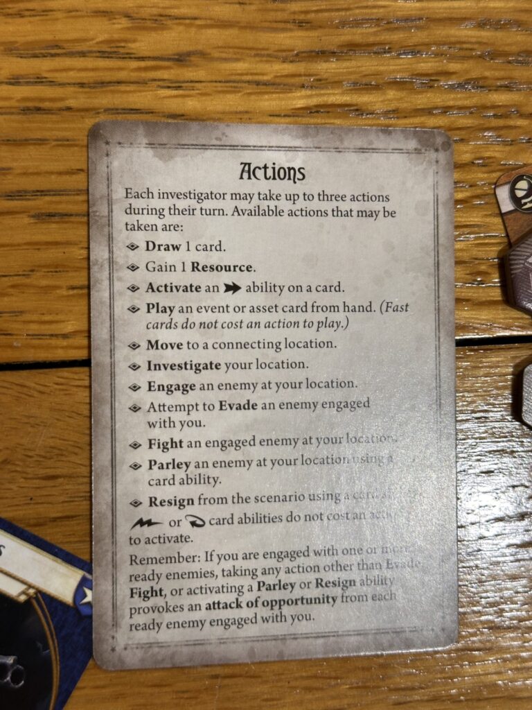 Gameplay flows through a series of phases, each one tightening the pressure a little more. The Mythos phase advances the doom clock and introduces new complications, often in the form of encounter cards that can disrupt your plans in ways both subtle and severe. The Investigator phase then gives each player three actions—move, investigate, fight, draw—and asks you to make them count. On paper it’s straightforward. In practice, it rarely feels that way.