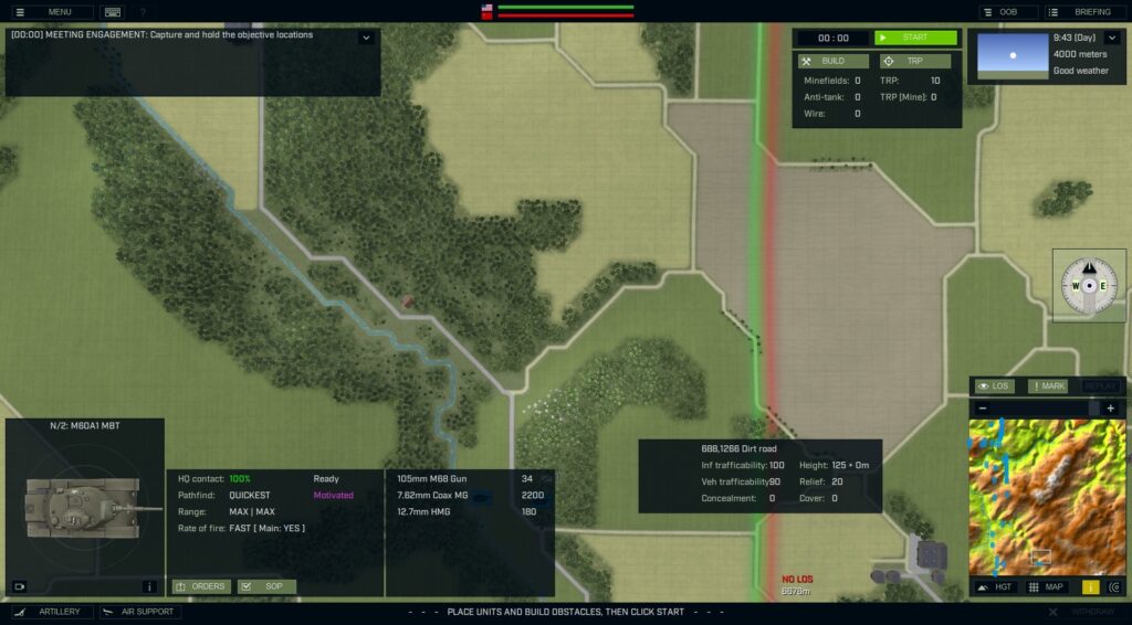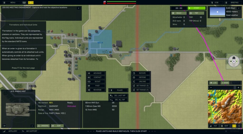 Once you’re all setup, and happy with your choices, this is finally where the action begins. Hit the “Start” button and watch how all your aspirations, calculations, and master plans work out. Now, remember, this is RTWP so if you notice something really bad happening in a certain part of the map… at the very least you can do is pause and adjust it. No more chances to move whole sections around (e.g. like during the setup phase), however, you can change the orders of every individual unit.(I’ve obviously run into units hidden by the FoW and been caught off guard). Luckily, most vehicles have a “reverse” in their tranny. You might suffer from a few losses, but it’s better than losing whole platoons/companies being ass-wiped for ya.