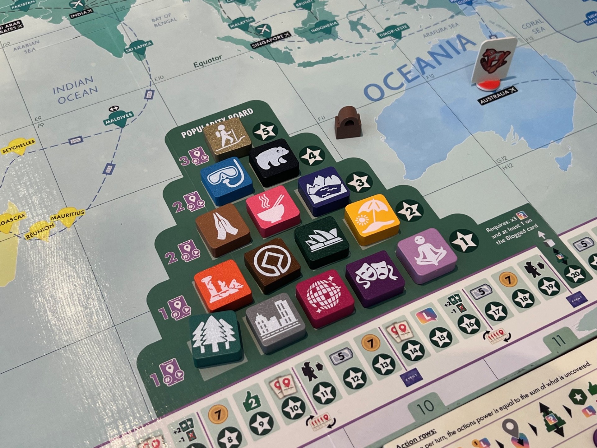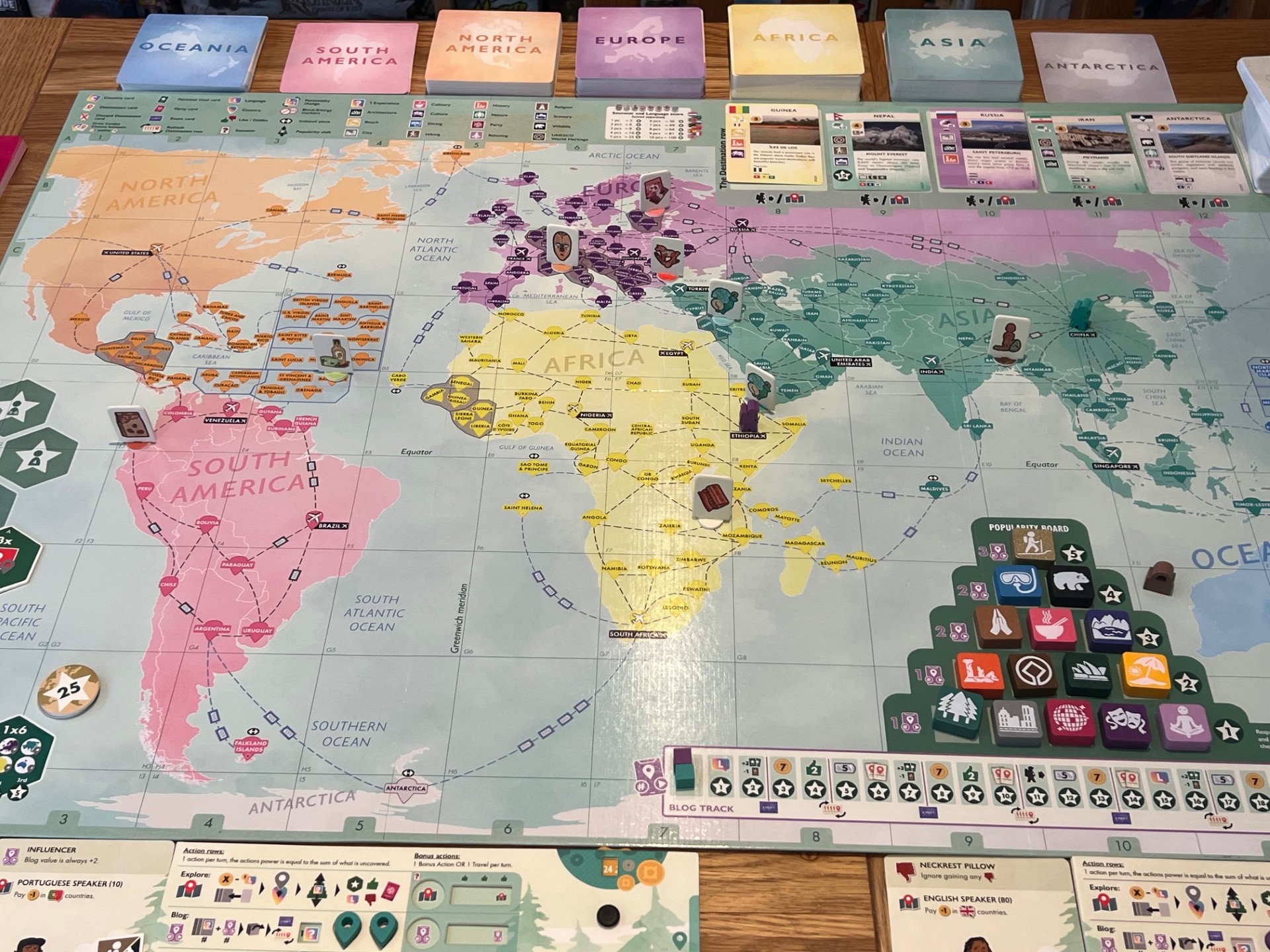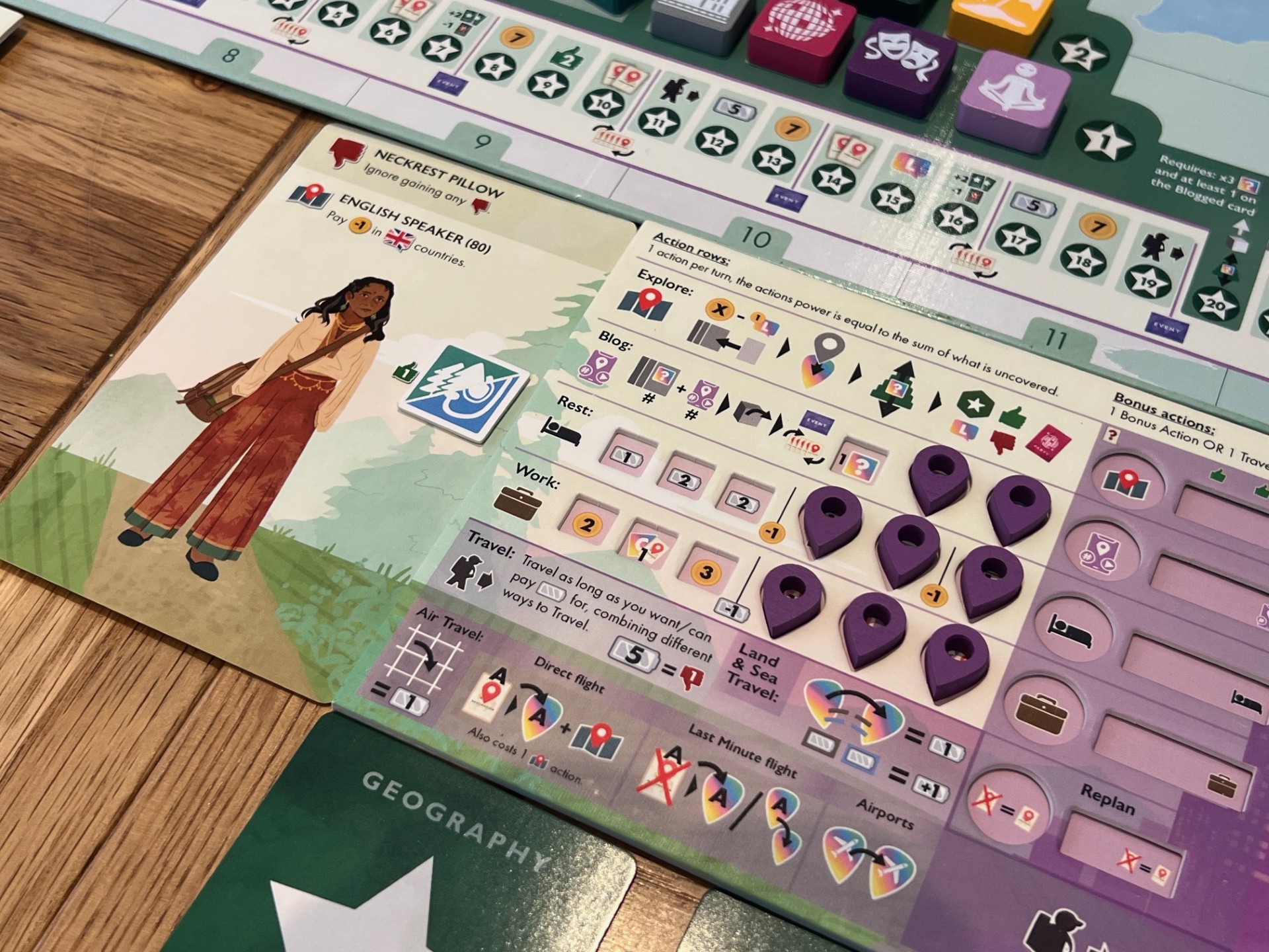 The game unfolds over a series of turns wherein the player will take one main action and then a bonus action. Actions include travelling (either by land, air or sea), exploring, working, resting and blogging, with a few minor or sub-actions (such as buying souvenirs) that are situational. Travelling costs energy or cards, with land or sea routes being especially tiring, and air routes being more efficient but coming at a cost of valuable destination cards. Movement of both kinds works a bit like it does in Pandemic weirdly, although the game itself is nothing like Matt Leacock’s cooperative classic.