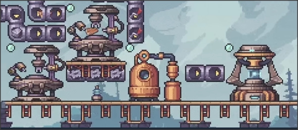 Although I have AutoForge described as a side-scroller in places, it’s not a one-way path at all. (A “side-scroller” to me is: you start on the left and are continuously being pushed to the right… which this isn’t at all). You can go back and forth as much as you want, left and right… until you reach the slowly blackening edges. As you trek along, the sides through which you may enter gradually move back, in both directions.