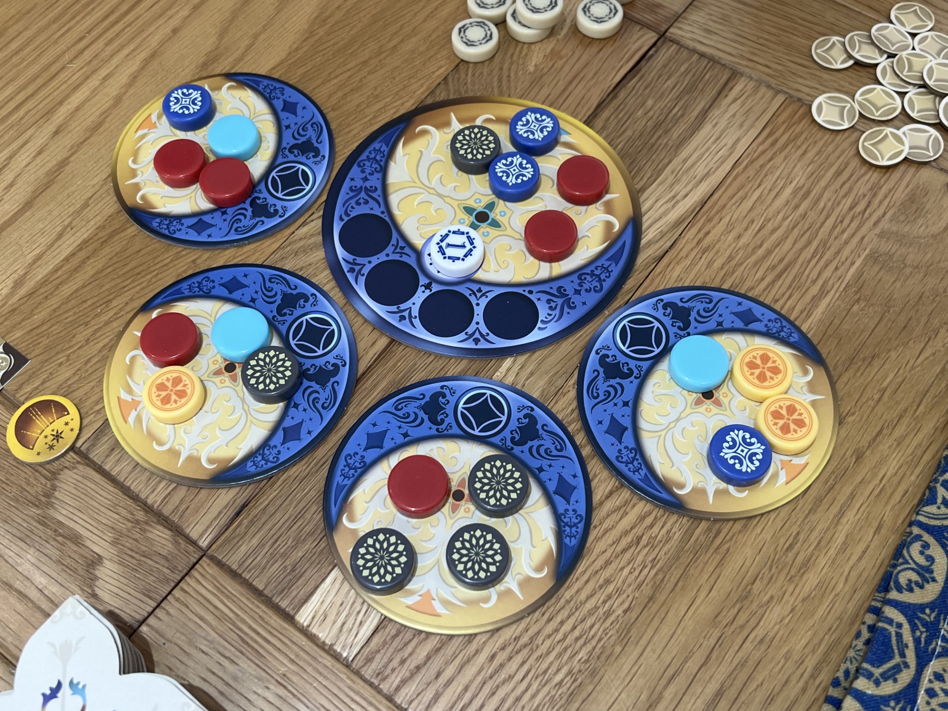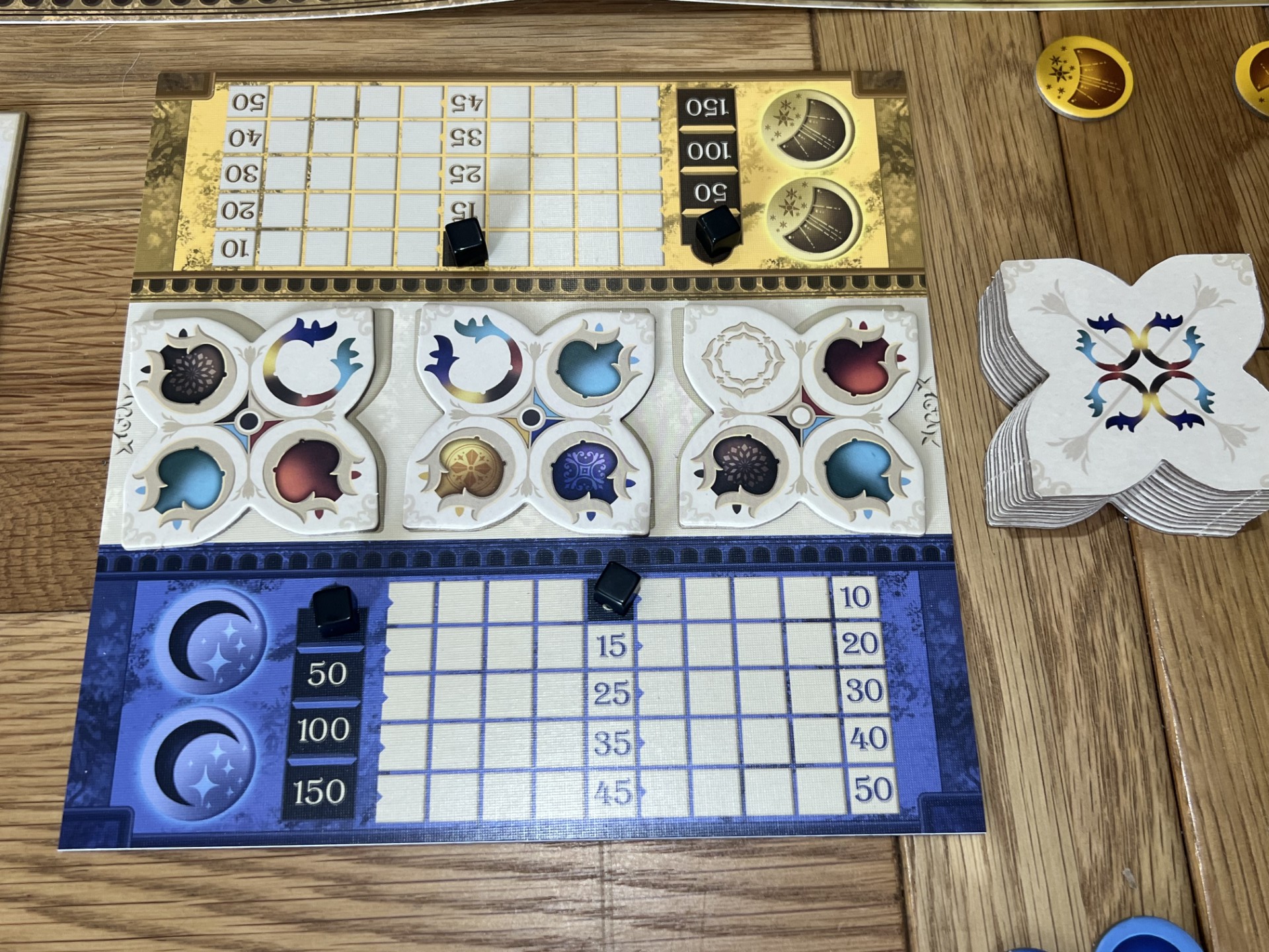 Scoring at the most basic level occurs when you do this. Move a lozenge from a complete row onto an empty space on a tile and it will score one point plus a point for each tile in an orthogonally connected way. Add a new lozenge to an existing arrangement of three (for four in total) and you’ll score four points, for example. At the end of the game, three additional scoring tiles (chosen at random) will provide bonuses for completed patterns of lozenges across multiple tiles — for example a diagonal row of six.