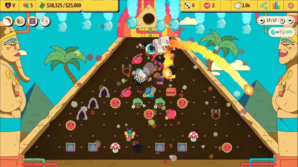 The fun is that you don’t really know what’s going to happen. Pachinko itself, perhaps moreso than other ‘mechanical’ games like pinball, are already impossible to fully predict due to momentum, force, speed and the positioning of the pegs. You can build a perfect path through your Ballionaire board and the ball may never even stray near it — even if you place out bouncers, jump ropes and more to try and direct it. Similarly, you might tuck away a crystal ball, caterpillar or cactus so that you gain bonuses but the ball never touches them, but your next ball might catapult itself directly at them.