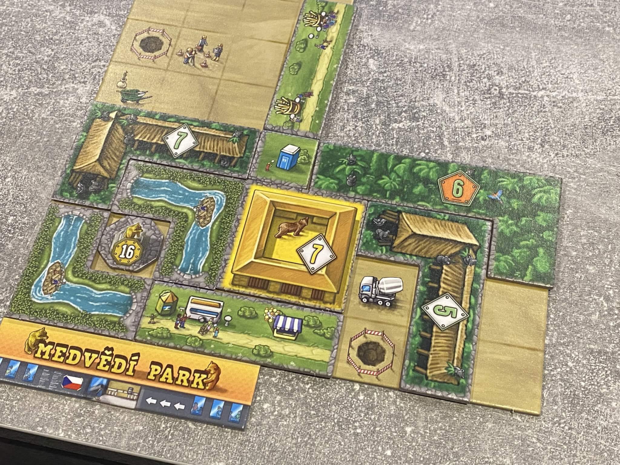 And as these parks come together onto their boards, Barenpark just looks fantastic. The polyomino tiles don’t link in any way via paths or visible cues (and thank God, because that would have been complicated) but they do look like an entirely convincing whole. Younger players in particular will marvel at the tiny koalas climbing trees and the pandas chomping in their play tunnels. I’d defy anyone to look at Barenpark and think anything less than “that’s pretty cute”.