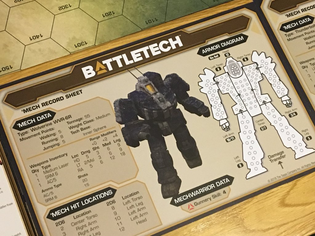 A really strong point for BattleTech (as a system) is the wealth of material made available online and included for reproduction within these boxed games. Players can download and print sheets for their mechs to demonstrate damage received, ammo remaining and so on, as well as for tracking build and loadout. These features make playing the game a lot simpler — for example if a mech’s arm is hit for ten damage, the player will strike ten points of armour off that arm until it is destroyed and the damage moves inwards.