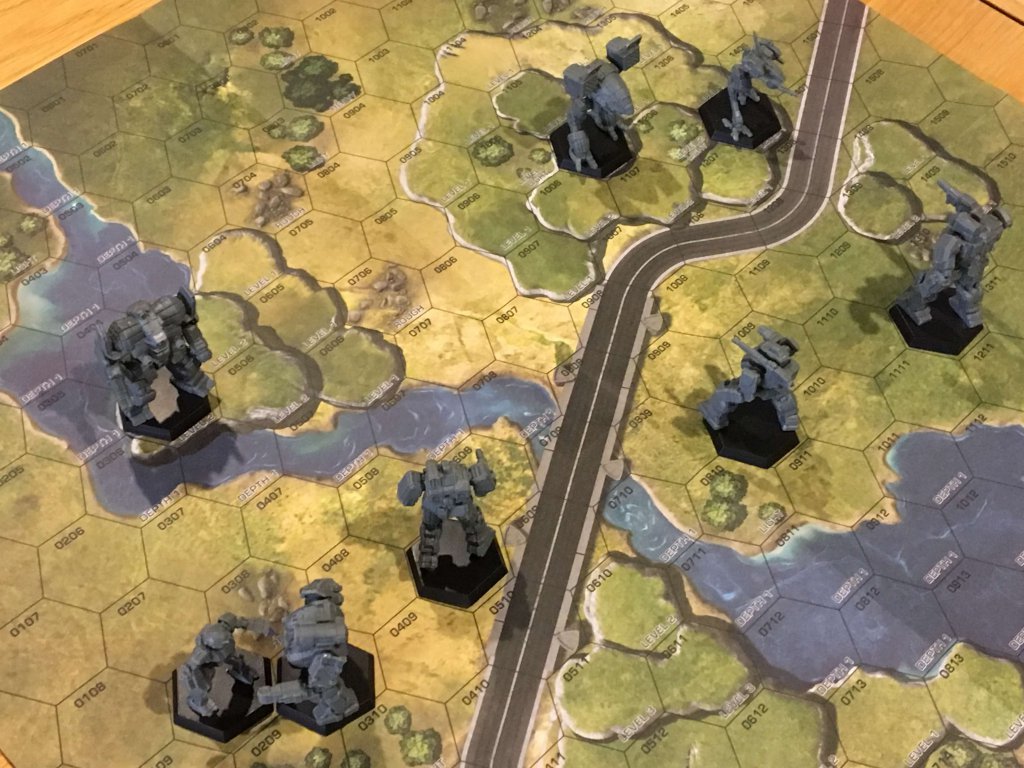 I’m mentioning this because I’ll be focusing entirely on the board game adaptation, which is played on printed maps (included in the box), covered in hexagonal spaces that determine the facing and movement of each mech. When played as a board game, BattleTech offers both a simple rule set and an advanced variant, with the latter being the normal way to play in most circumstances.