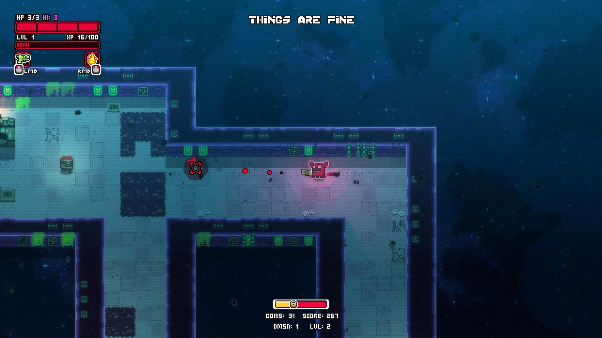 Weapons come in all kinds of flavours including regular small machine guns, shotguns, pistols, and rocket launchers, to the downright bizarre creations of mankind like the “electrifying unicorn launcher” or the “bouncing nyan shotgun”. There are also melee weapons too but we left them alone as by the time we found them we were heavily into “bullet hell” territory where each hit knocks off a section off your health ‘n while hearts aren’t that hard to find in chests, we hardly needed them.