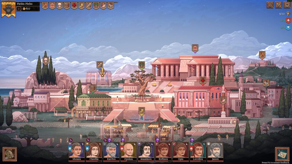 Your town management screen itself is a far cry from the combat. You build up your town slowly but surely, and gold isn’t so plentiful that you max everything right away. This led to me piling all I could into the Academy and Infirmary so I could heal more of my willing subjects, and upgrade their combat skills. Another player might have prioritised the Shrine, providing passive buffs to gladiators who worship certain deities. These buffs can incentivise changing a gladiator’s skills and gear, which is always nice so players don’t feel they have to stick to whatever they started with. Someone else might have built the Dark Alley, which is able to provide sneaky sabotage items that injure and hinder enemies before fights even begin.