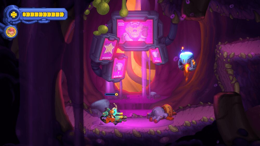 Blubber Busters has an interesting visual style that pulls a bit from other styles here and there and makes it as unique as its action-packed, character-swapping gameplay. Every enemy, character and each set piece has a vibrant display of color that makes it pop from the intricate details of the parallax backgrounds in each level. Foreground details set closer to the camera give further depth, helping create the illusion of peering into this alien world. The stylized mix of 2D and 3D used together makes for a beautiful world without requiring the hand-drawn animation of rotations and such, but that’s not to say there is a lack of artistic expression: everything is hand-painted with a stroke that feels like traditional cartoon animation.