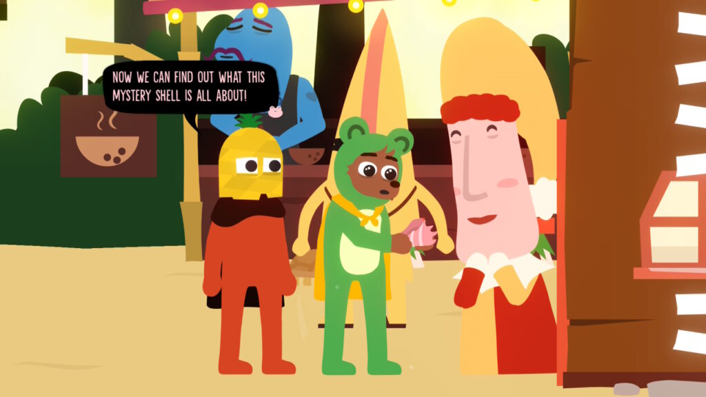 The story starts with Bonnie Bear emerging from their home, having clearly been “going through it” (honestly, relatable), and in order to celebrate all their friends clubbed together to get some frogs for the group, so they can partake in the joy of Frogtime. But what’s this? A mysterious stranger left Bonnie another present. A magical shell, swiftly stolen by Rik Spek (look at his six pack), and by the rules of the beach, he must be defeated in frog-based combat to claim it back! This, of course, quickly spirals out of control, and the unique writing spirals into a quest to cross the world playing frog-time.