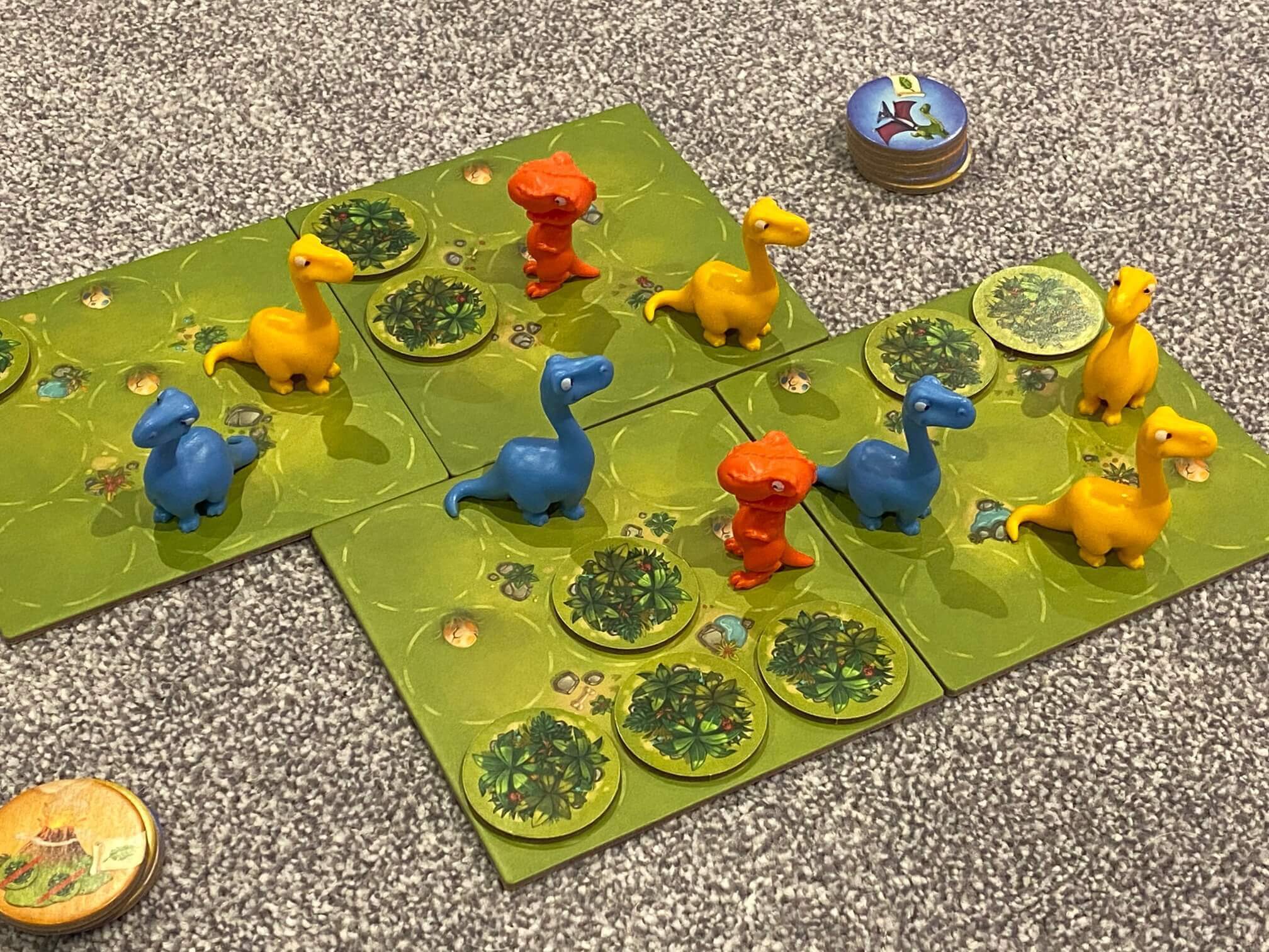 On the second player’s turn, the game begins properly and players can now take two actions per turn each. Aside from moving a diplo any number of spaces orthogonally until it meets another diplo, a greenery tile, a T-Rex or the edge of the board, players can also use their turn to move a T-Rex, if there is one on the board. When this happens, a T-Rex will also move any number of spaces orthogonally, but if it meets a diplo, that diplo will be scared away and forced to leave the board.