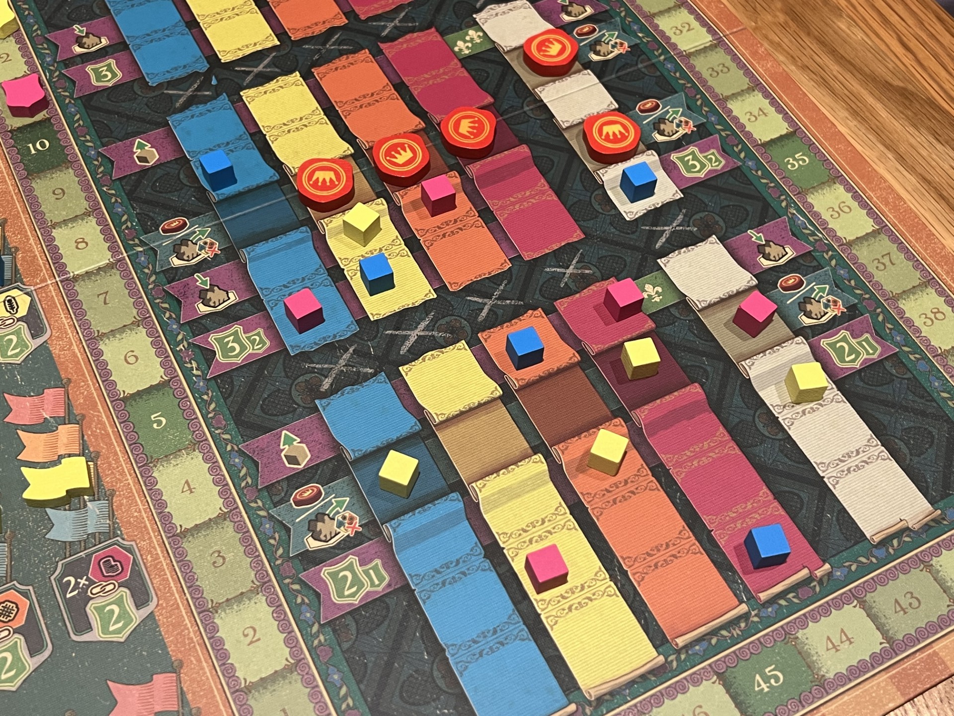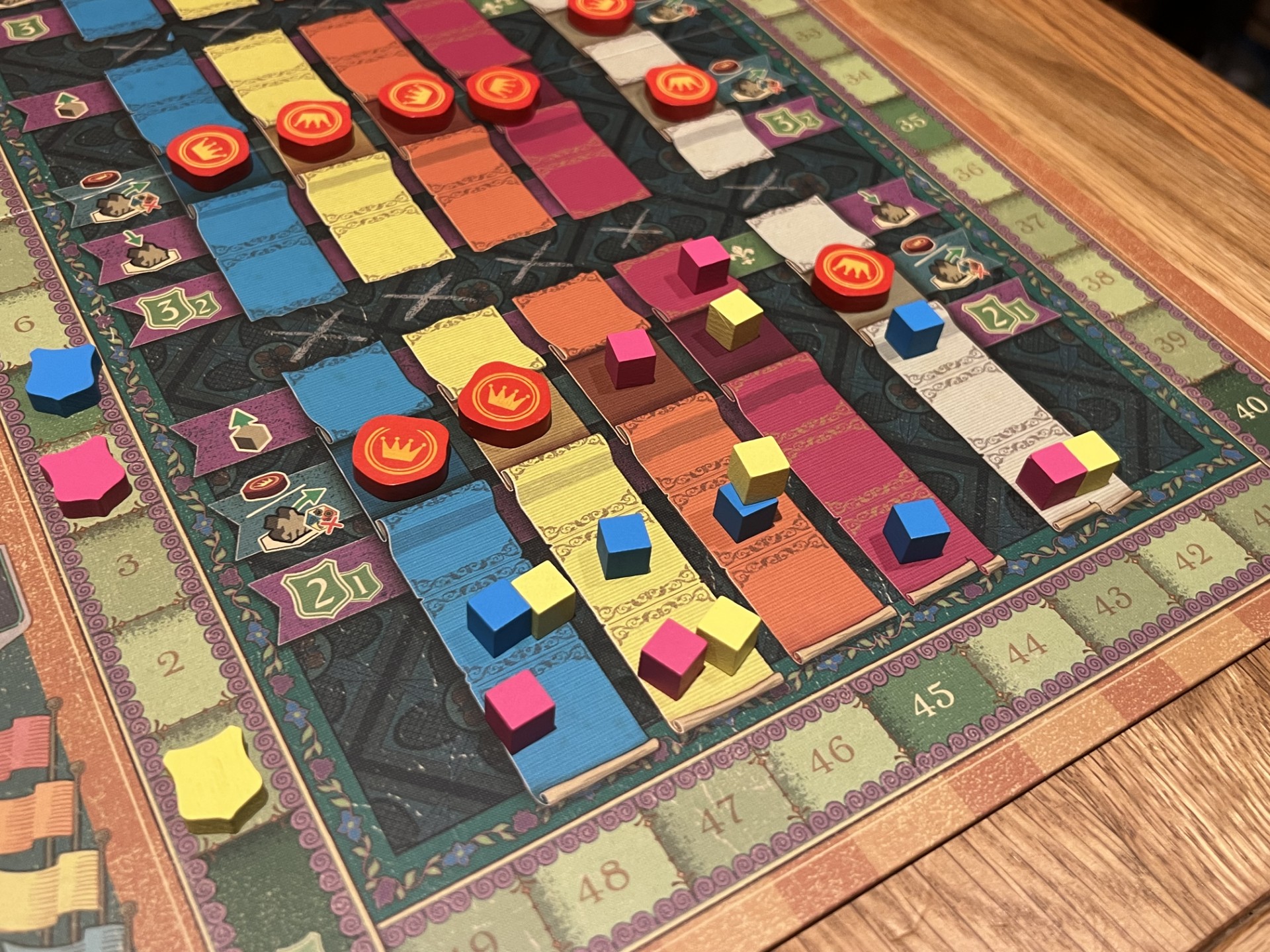 The components are very clean and functional. Ian O’Toole’s artwork is rich, crisp and evocative as it always is, with clear iconography and an opulent palette that suits the theme. The board is plain in some ways, with villages being the only real feature, but it soon fills up with envoys that bring bright colour and texture. Player pieces are wooden horse-shaped envoys — a charming touch that reinforces the theme and emanates quality.