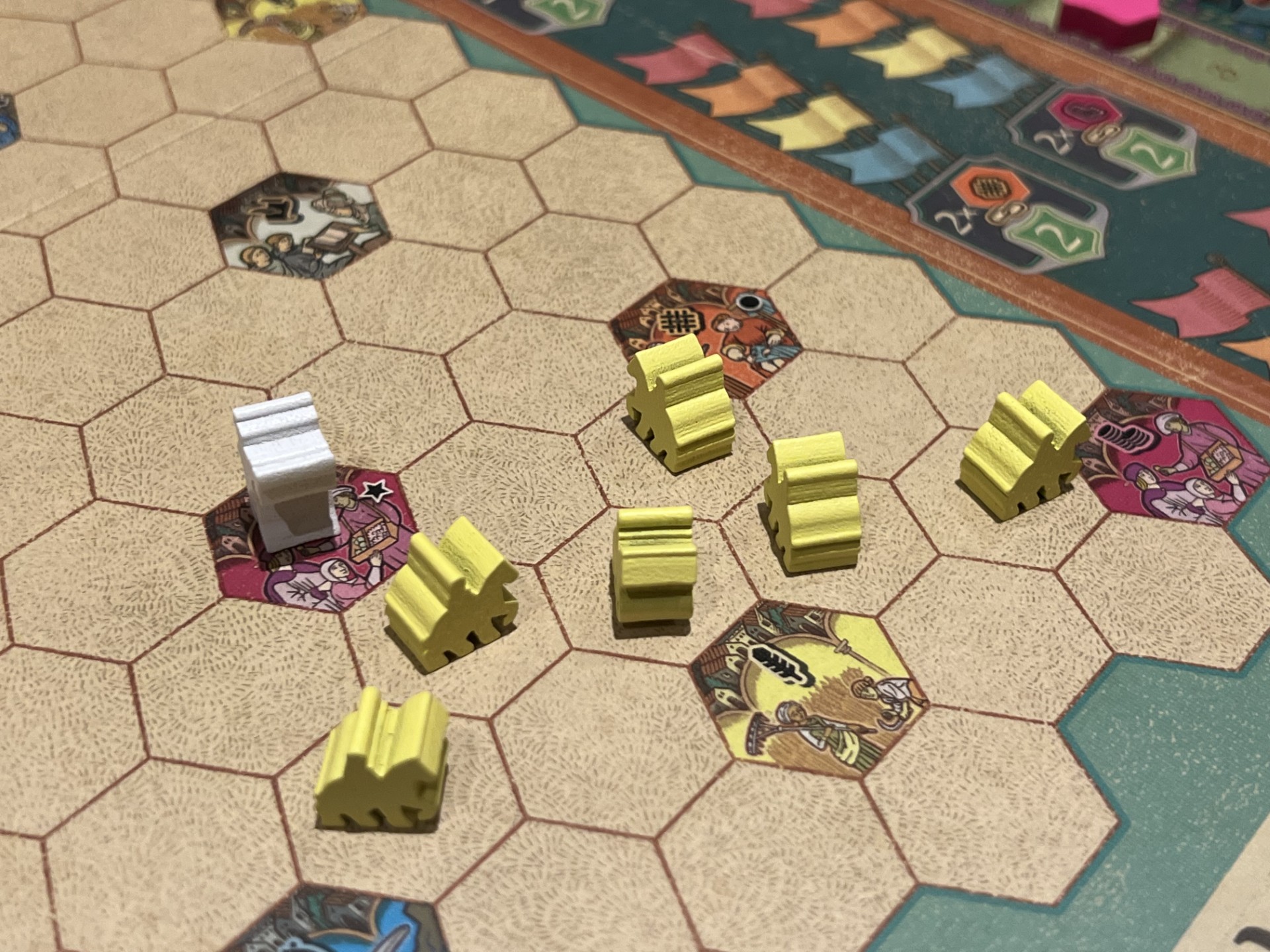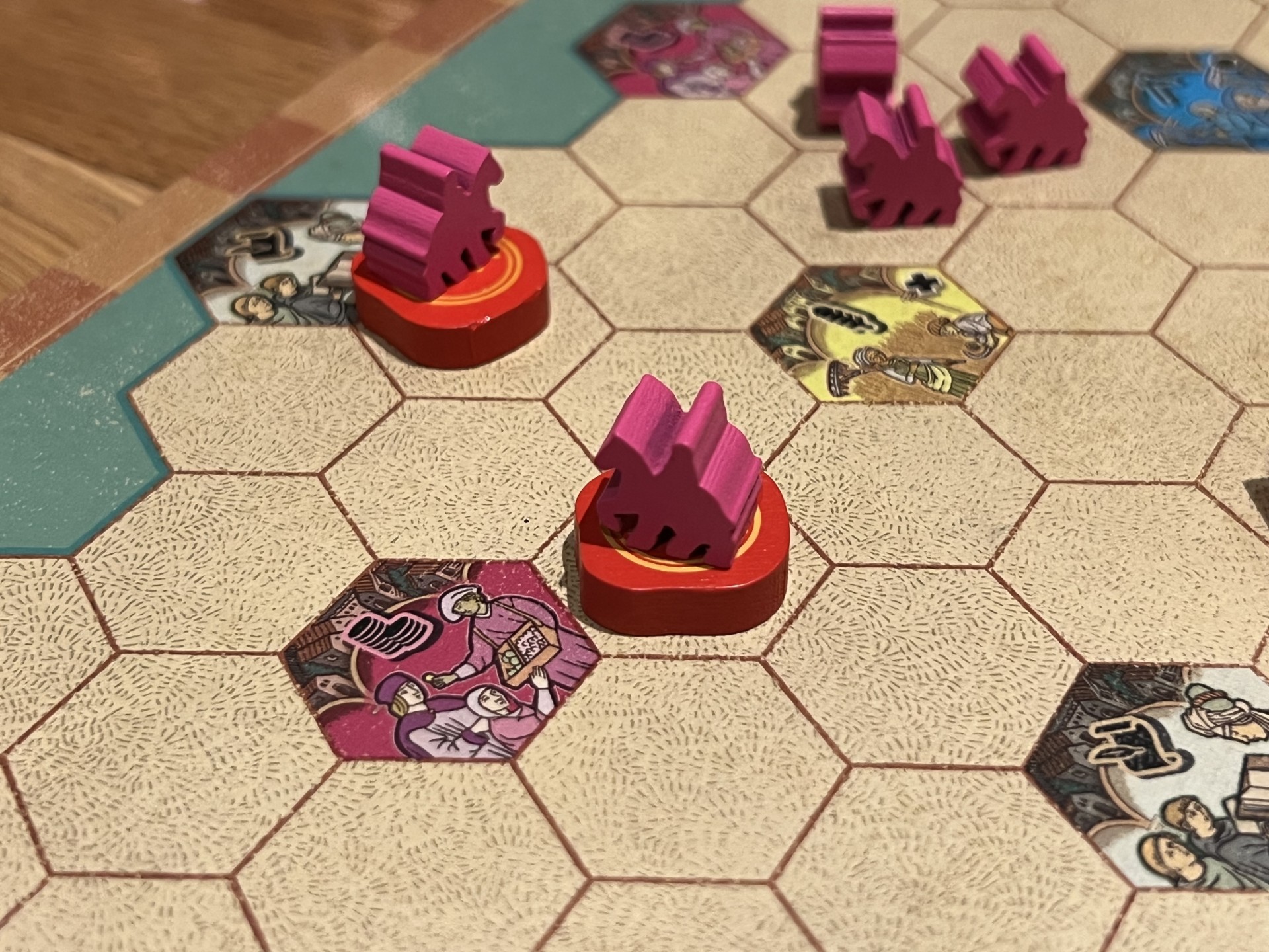 The core mechanic revolves around placing envoy meeples onto fields in such a way that they connect to new towns. Towns will not “trust” a single envoy, so you’ll never score for a “group” of one envoy, but as soon as you add a second (or third, fourth etc) envoy to a group and it connects to a town for the first time, you will score.