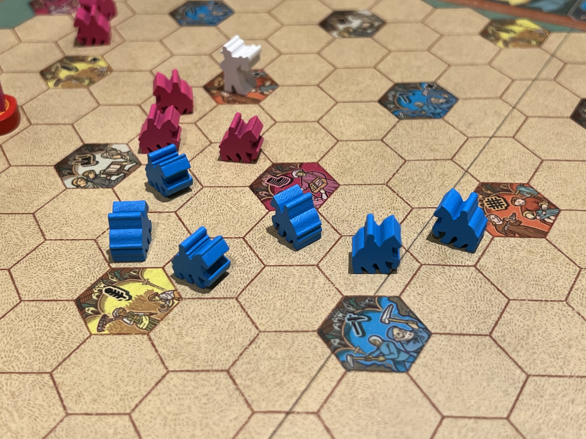 This means that interaction is high — even though it is indirect. Villages are more valuable when visited for a second time, so the interplay between players, especially at three and four players, is significant. You will want to be placing groups in and around other players, but because the villages are quite tightly packed together, routes can quickly be cut off – it only takes a couple of interested players around a handful of villages to make the whole area both attractive and challenging for the third and fourth player. Equally, for two players, the need to be close to each other exists, but the lack of pressure for space takes away some of the tension.