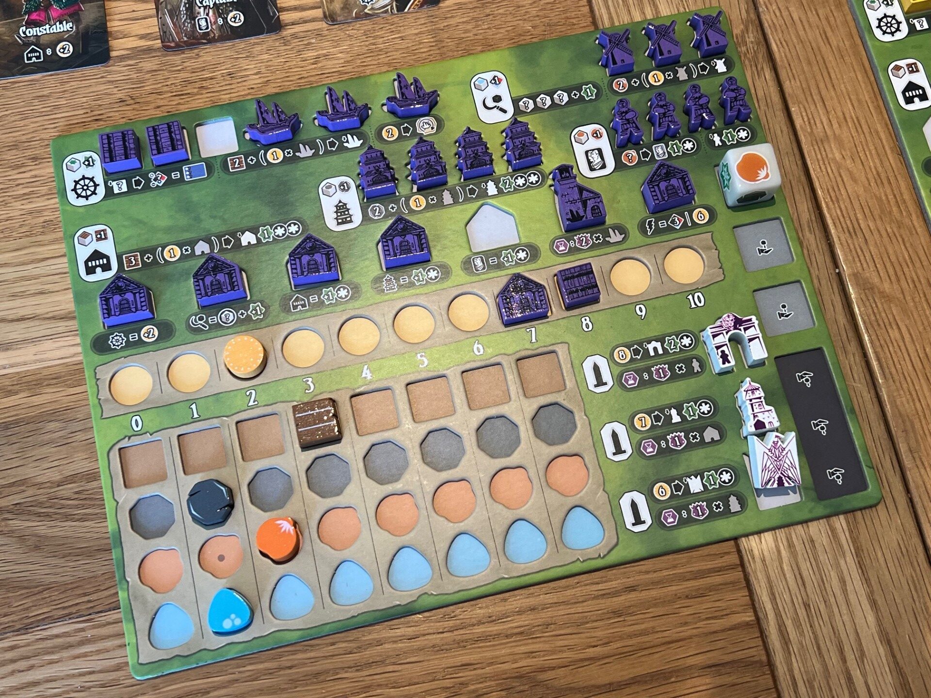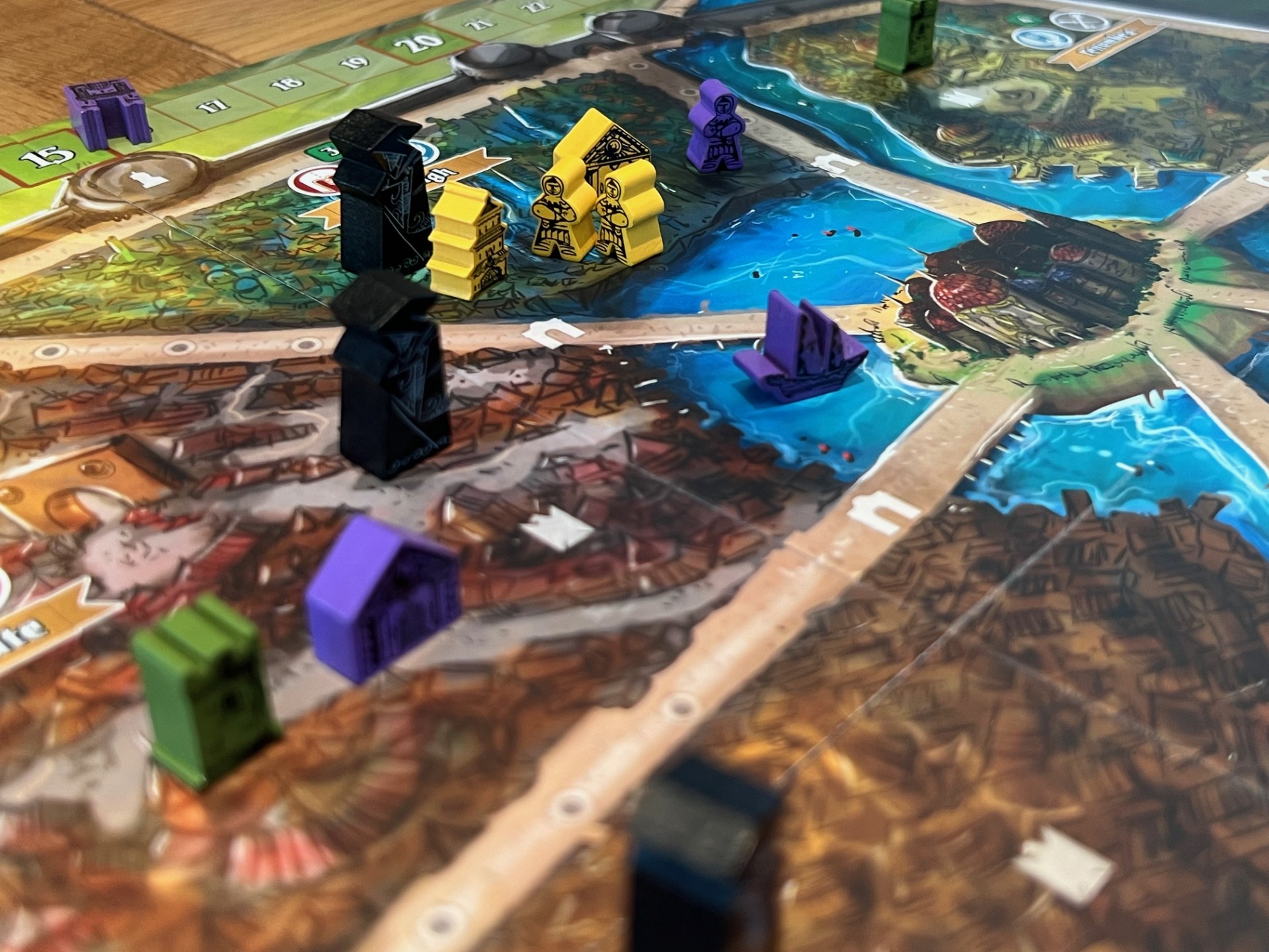 When scoring comes around (at the end of each action phase) players will look at the three regions that will score this turn, they’ll calculate all of the influence in the region (for all players) and then based on who was first, second etc, they’ll distribute points accordingly. Most buildings contribute one point of influence, however some buildings such as windmills change this — with windmills sitting between two regions and adding half a point to each, and monument buildings each having scoring criteria of their own. Wharf cards are also scored at this point, and these link to trade actions taken that round.