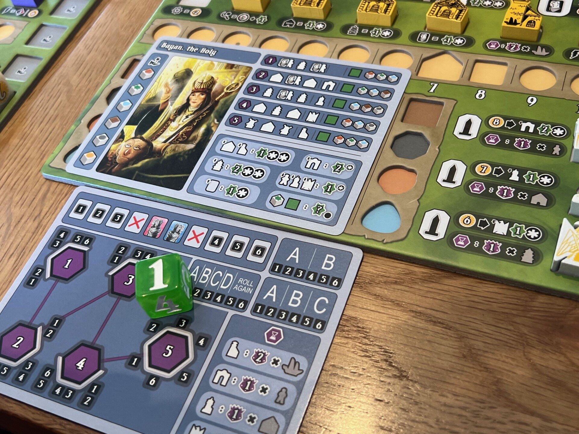 Players will take three “main” actions per round, and may also build a monument as a free action if they have the resources. To represent their actions, players will use the dice that were drafted at the start of the round, and if the dice used matches that shown on the action, they’ll get a bonus resource. Almost all actions allow the player to do “something” and to place a building — for example taking the temple action will allow the player to gain guild influence and build a temple, and if the die used was an influence die, they’ll get a bonus guild influence.