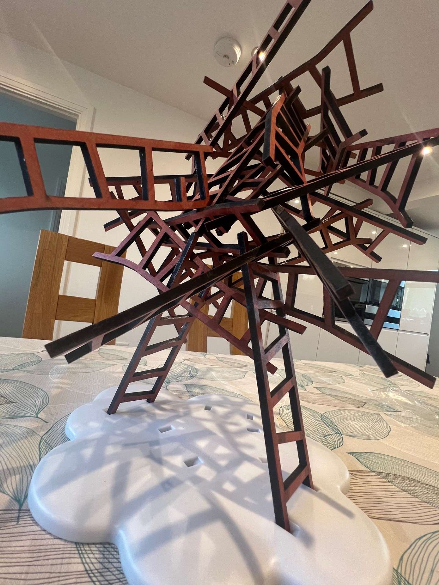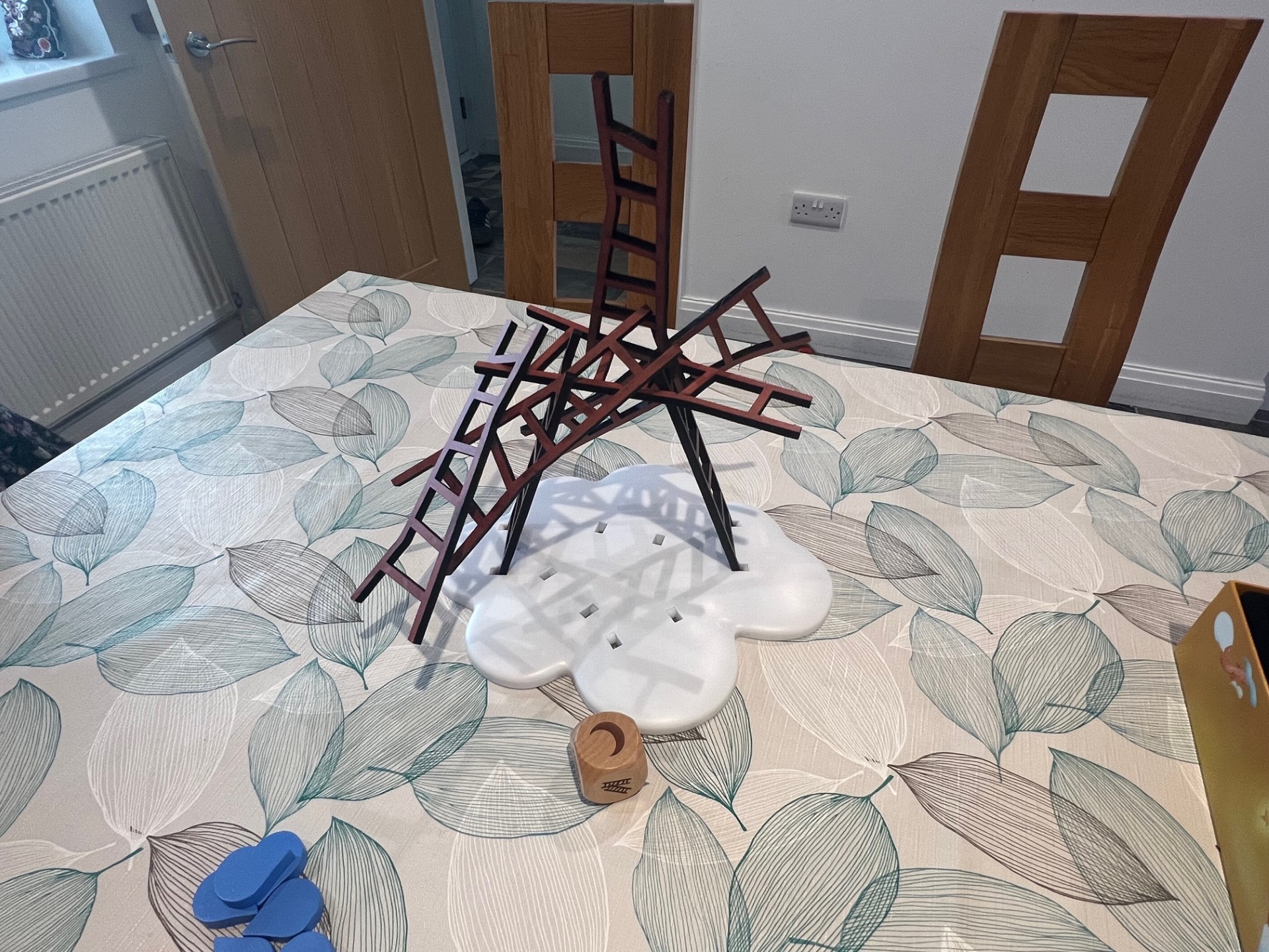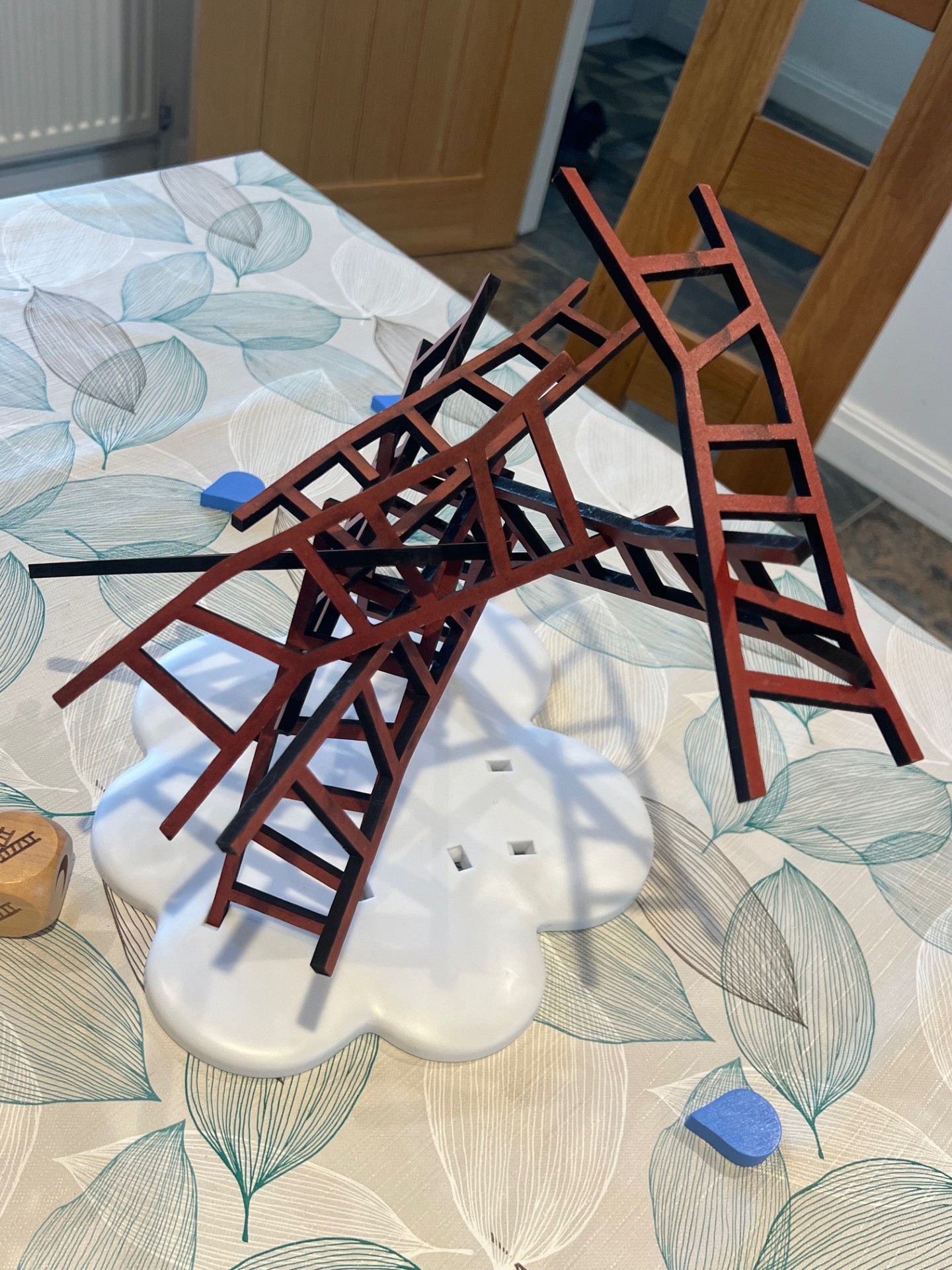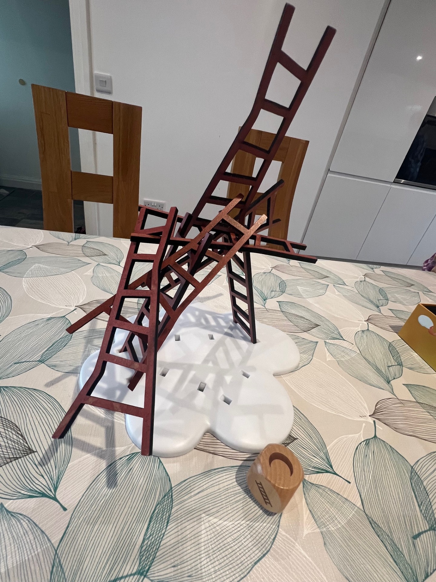 On your turn, you roll the satisfyingly giant die — an object so chunky that feels like it belongs in the Victorian era — and then place a ladder according to the result. One ladder? It must touch exactly one existing ladder. Two ladders? It must touch two. A moon? In that case, your ladder must become the new highest point in the entire structure. That’s it — the whole game, and yet it just works.