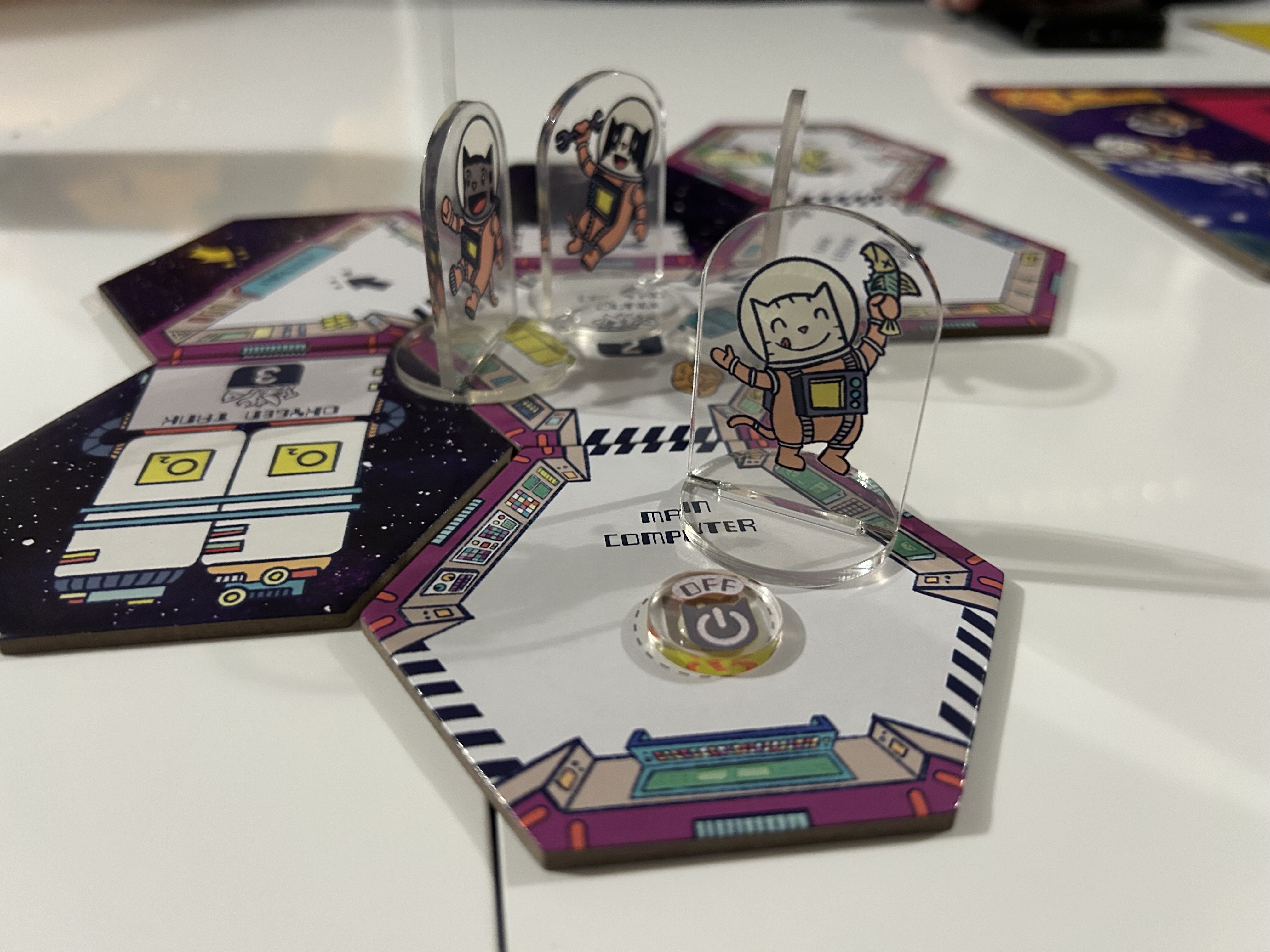 All of the cats are working towards a specific mission, which is to build the entire space station, turn on the main computer, and then get yourselves to the evac pod without the energy of the space station running out. The station does have a few starting tiles, but you will need to use at least one of your two moves on your turn to move to different rooms, gather material, and place on rooms so that you can build out the ship.