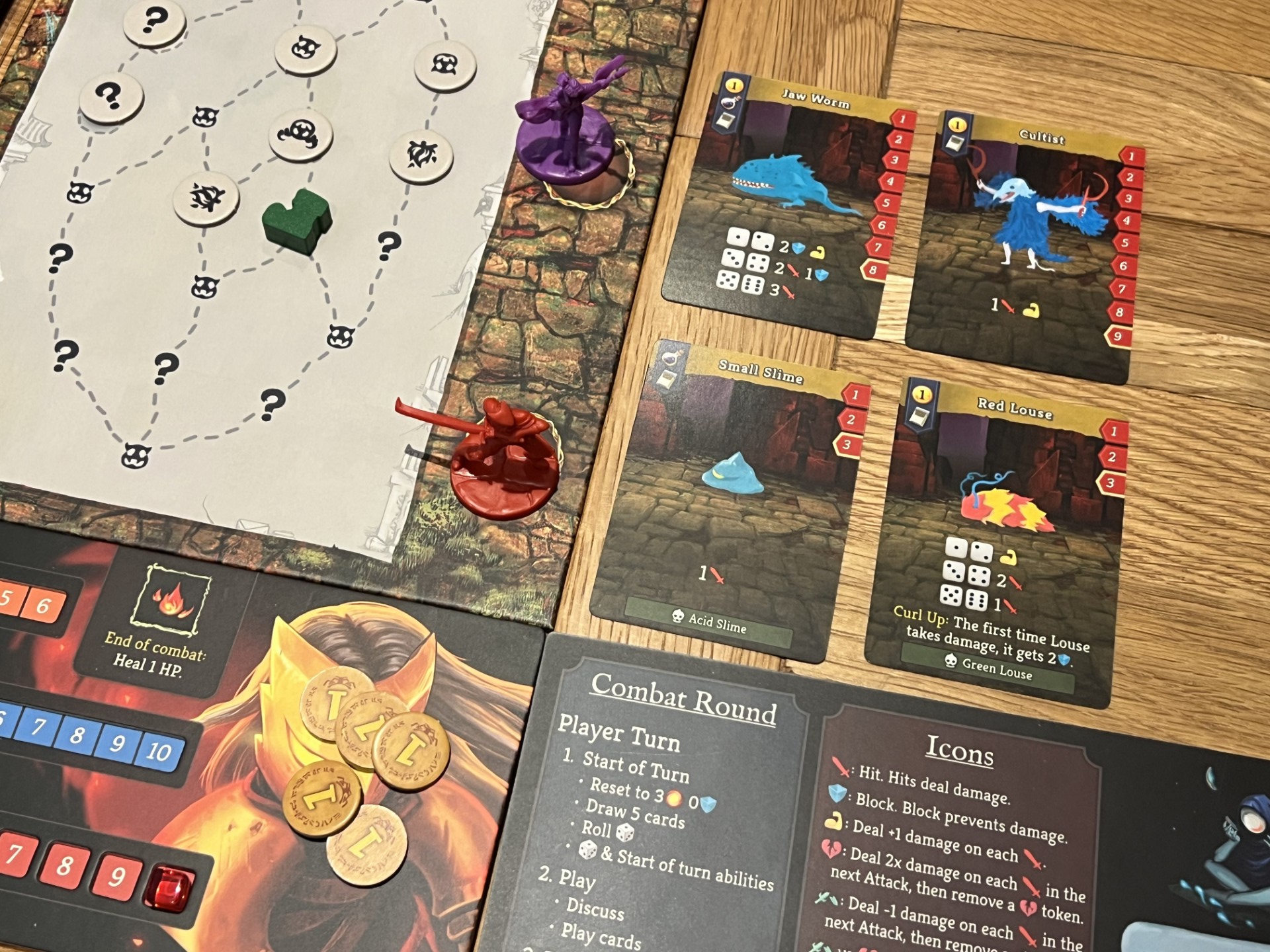 In Slay the Spire the players take on the game. Each session is split into multiple encounters with a map (of which there are a few in the box) guiding you from the bottom of the spire to the top (get it now?) There are often choices to be made between a left or right fork and each one leads to something like an enemy encounter, a chance to regroup or less frequently elite or boss enemy encounters.