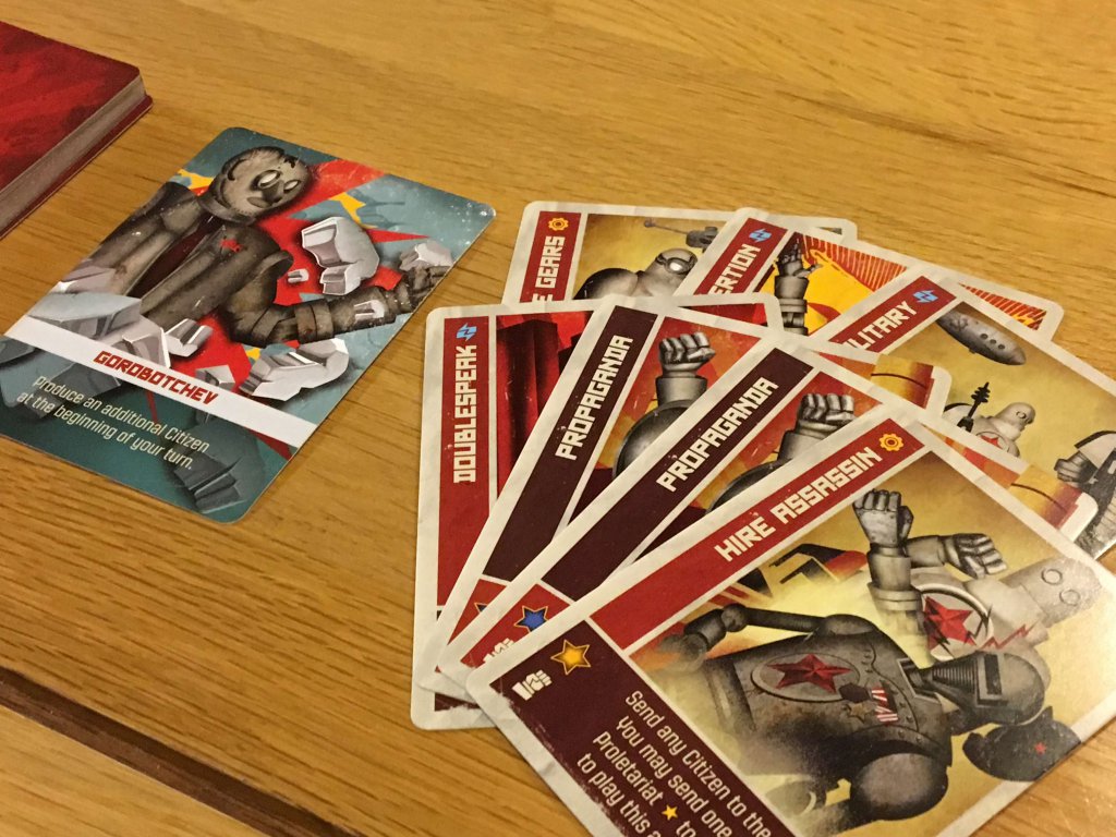 Whether you choose to use those decks or not, you’ll also have the choice of several leader cards that have amusing names that riff on both the communist and robot themes. Artificial Stalinteligence, Computin or Simulenin as well as my personal favourite, Gorobotchev, to name but a few. The rules state that a leader card is not mandatory, but frankly, the game is no more complex when they are used and it certainly adds a touch of personality.