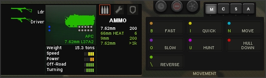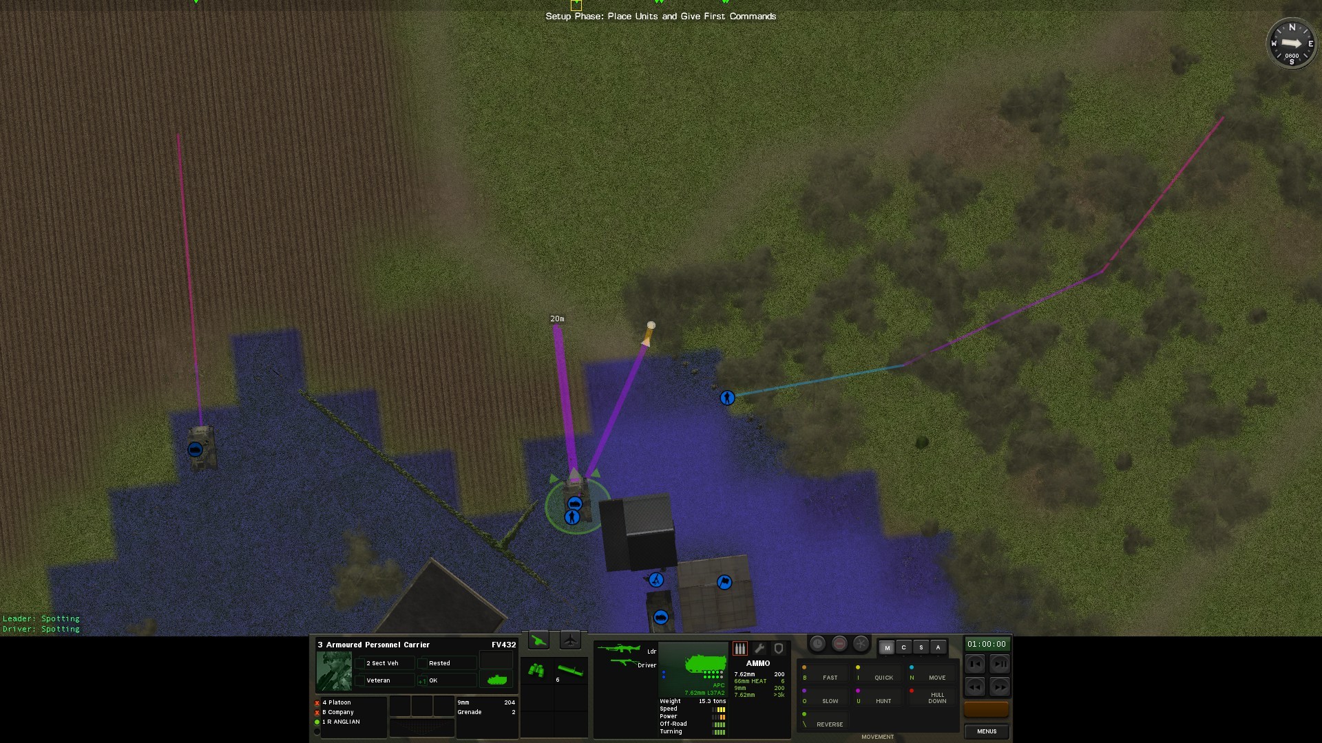 The red on the Tank Destroyer on the left = “Hunt. The pinkish-violet is actually that vehicle shooting smoke. The violet is “Slow”, the yellow at the end of it is fast. Then, I’d probably add a ‘drop troops’ command, there, in the woods. The lone infantry on the right is: Move, Slow, Hunt.