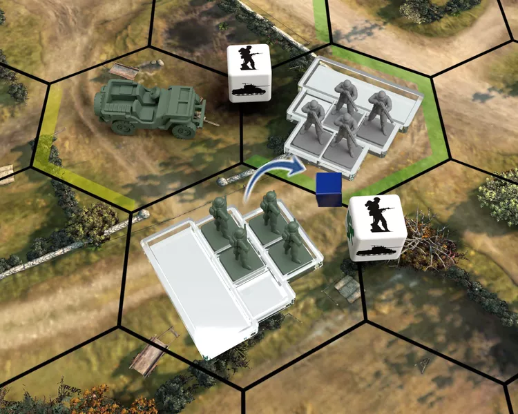 One of the most distinctive features of Company of Heroes is the way that units are represented. Rather than miniatures alone, the game uses plastic slotted trays that hold up to five miniatures and some dice. Each miniature represents the unit health, and may also include special features like a mortar or machine gun, as well as dice turned to specific faces to show upgrades (like additional damage or line of sight).