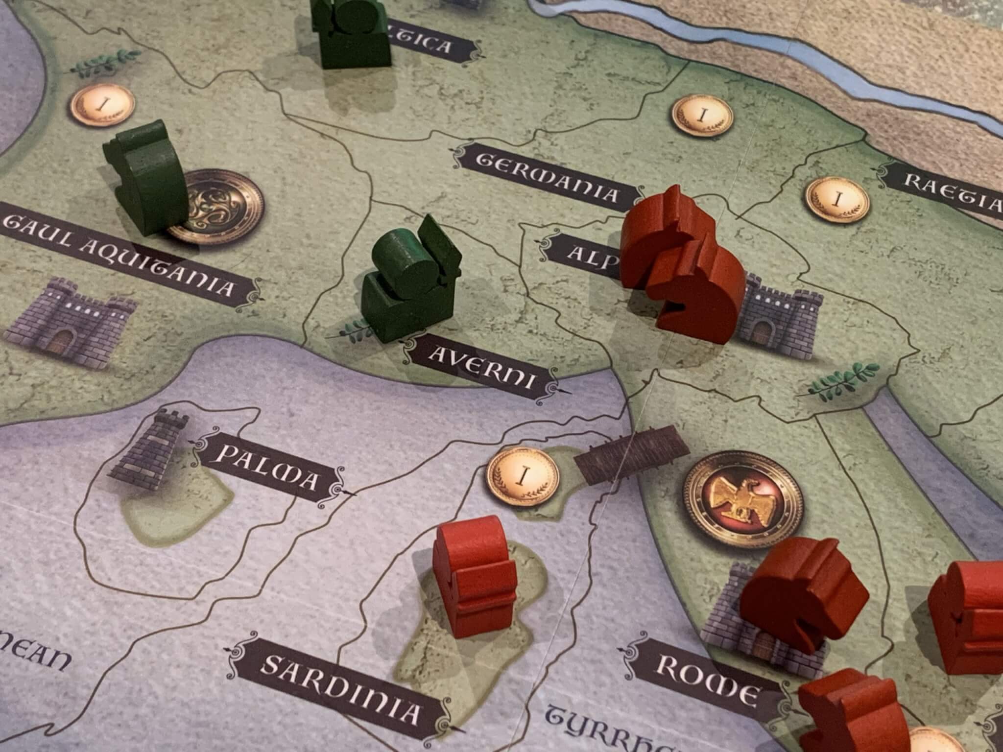 Each empire has a starting setup that will generally position it in a historically accurate location, with two infantry and one cavalry unit, as well as control of some grain and/or coin. During the first phase of each turn, players draw coins for each coin shown on states they control, whilst the number of grain tokens they hold indicates their supply line capacity — which dictates how many armies they can maintain.