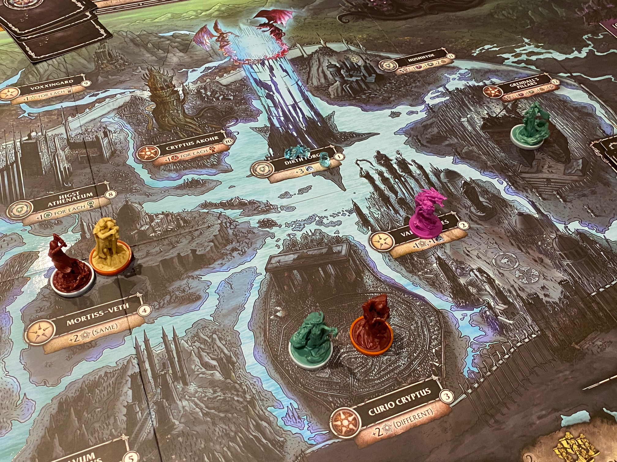The players must collectively pay a tithe to these forces each round, with the currency that drives much of the game being used both for this tithe and a lot of the other activities known as Etherea. The game increases or decreases the tithe based on the current level of suspicion, and players who cause either track to breach lose unity — which acts as both a key scoring mechanism and a countdown to the end of the game.