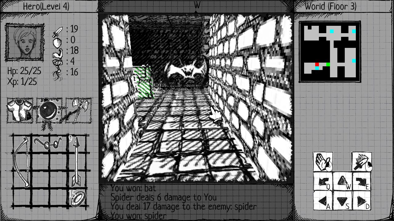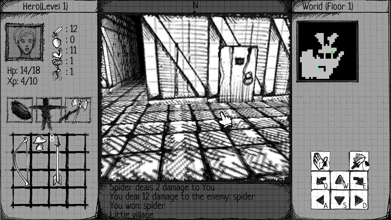 Once you have your choice, Paper & Ink Dungeon unceremoniously drops you into its world. You start in a village right next to the dungeon. The village has no shops or inns, but some spider-infested houses as well as an adjacent forest with plenty of edible mushrooms. Nobody but the blacksmith seems to be around, so you are free to loot all the houses. Equipped with some random items, it is time to enter the dungeon, which houses monsters that get progressively more powerful as you delve deeper into it.