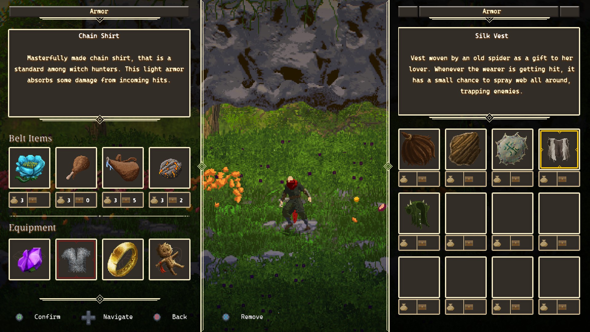 In Crimson Capes you explore a beautifully rendered pixel fantasy world, with 3D rotoscoped animations. Mechanically, though, you won’t be levelling up and investing in stats. Hell, you won’t even be finding new weapons and gear in the Souls way. Instead, all these elements are closer to a Metroidvania in style. Your armour and gear aren’t statistical changes but instead carry unique effects. Things like covering enemies in spider web when they attack you, or increasing the damage of running attacks.