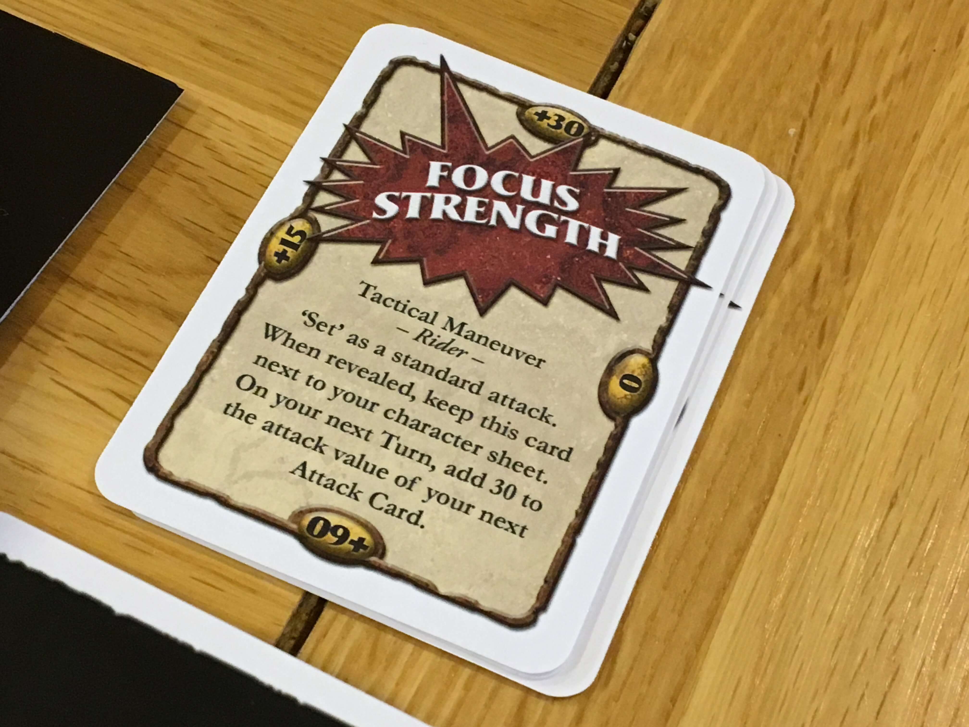Once the players have assessed their hands and seen the enemy they face, they each place an attack card face down in front of them. These cards are then resolved in player order by flipping them over one by one. On each attack card there is a value such as 5, 10 or 50 and some have special attacks which cause critical hits, sneak attacks or other effects. This damage is resolved one card at a time until the monster has zero health, at which point it is killed and the player who dealt the final blow claims its card (and the associated prestige points).