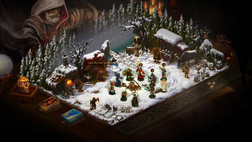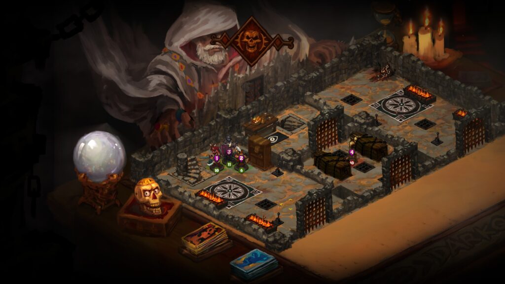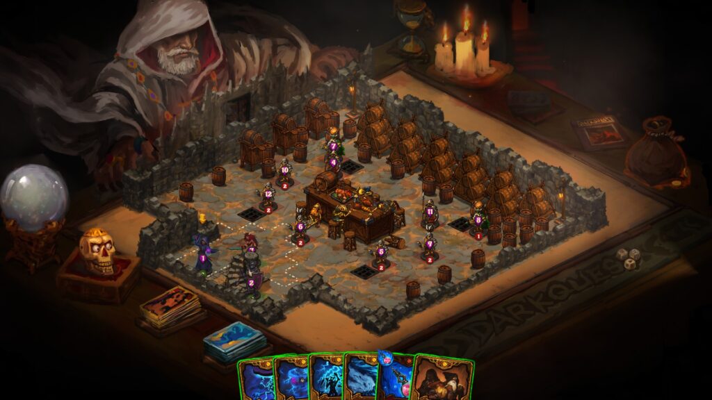 Visually, Dark Quest 4 absolutely nails its aesthetic. The game has a painted, tabletop look that immediately clicks — like a slightly less grim, less polished Darkest Dungeon. Playing feels as though you’re hovering above a physical game board. Your bag of coins sits off to the left, clickable at any time to check your gold. Nearby are two decks of cards that wiggle enticingly when clicked; I kept expecting them to do more, and if they do, I’ve yet to discover it. Looming above the board is the evil sorcerer, hidden behind a GM screen, occasionally chiming in with threats. These small touches add a lot of charm and really sell the tabletop illusion.