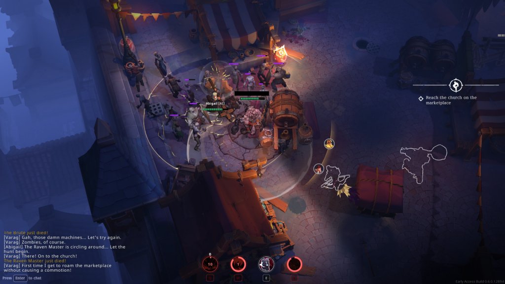 Like other survival games, the gameplay is focused and well-executed. I was incredibly impressed with the character roster – Varag the werewolf plays like a tank with short bursts of damage; Runolf is a healing and damage hybrid; Rose and her pet squirrel Twig serve as a semi ranged damage fighter, and Sister Abigail is a warrior nun who serves as a brawling damage dealer. Each colorful character plays a specific role in team composition, leading to some really well thought out fighting strategies.