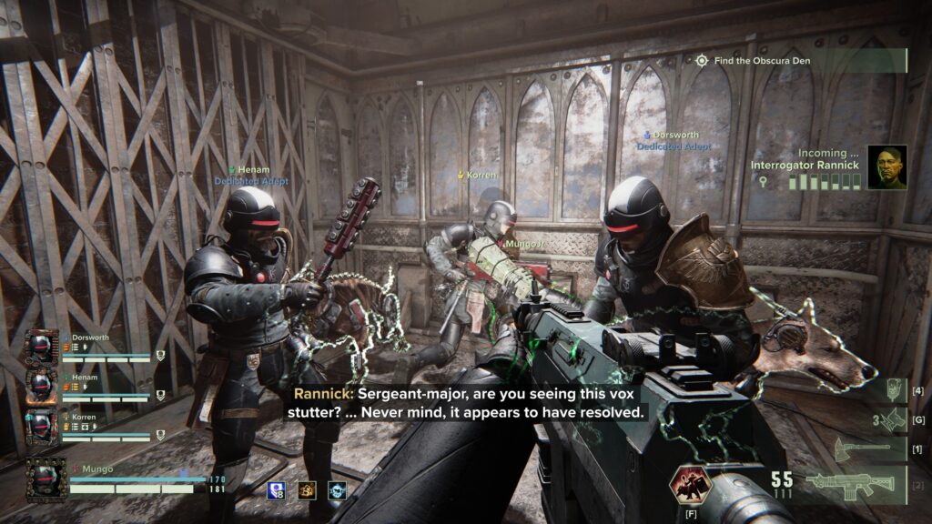 Your Arbites dog companion also has a bit of a mind of its own, with it mainly focusing on specific targets, or — at times — running quite far away leaving you on your own against some of the larger swarms of enemies. But, against singular, more elite enemies it can get you out of pinned attacks (such as from pox hounds) and can pin other enemies to the ground and maul them. So, it’s a bit of up, and a bit of down.