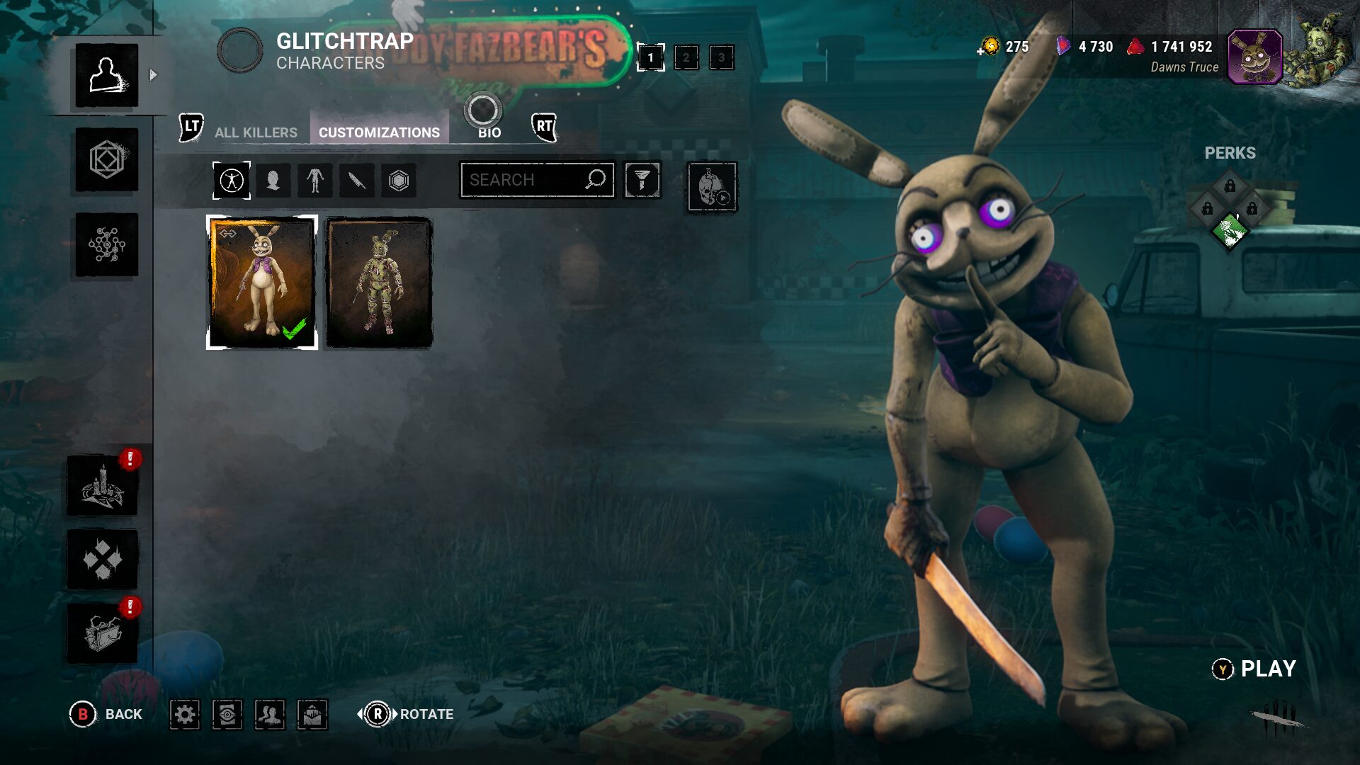 Springtrap also has a few skins from various moments in the franchise. As you can see from my screenshots, I used the Glitchtrap version of him, a version of him that was found infecting some old circuit boards and tapes and then used to build the VR game Help Wanted, developed by Steel Wool Studios, who now develops the main franchises games. Most impressively to me though, from the movie, we have a one to one skin of Matthew Lillard, the man who played Springtrap in the movies. It’s even voiced by him too; and the likeness is genuinely uncanny!
