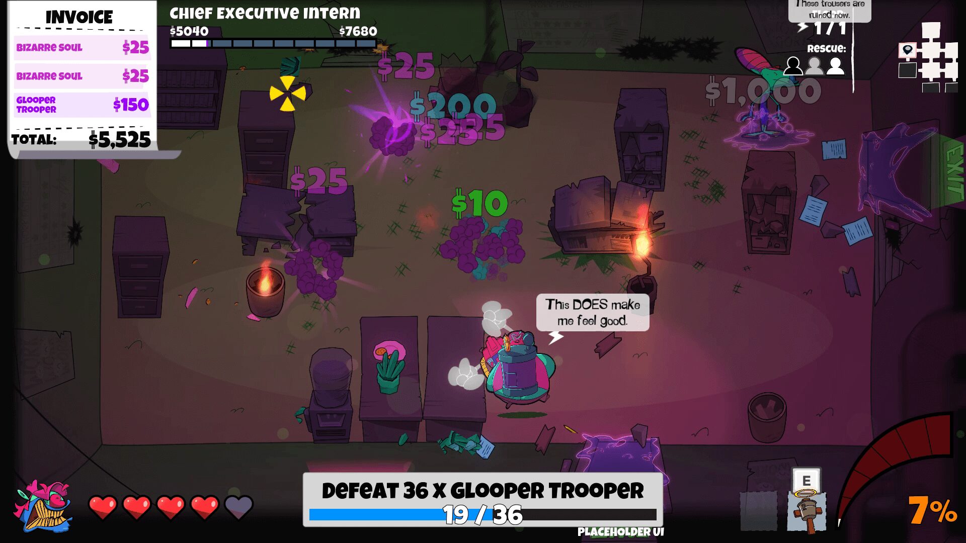 The main reason I wanted to revisit Dead End Job was due to the changes to its control system. Gone was the ~100° firing arc, replaced instead with 360° aiming — meaning you no longer get caught in corners, unable to fire at approaching enemies, due to the map layout. With the previous build of the game, my biggest issue was the way shooting worked; it hindered the player from being able to get to enemies and made the rooms more tedious to clear out. The game has also received a lot of visual polish since I last saw it back in early 2017 at that year’s EGX Rezzed.