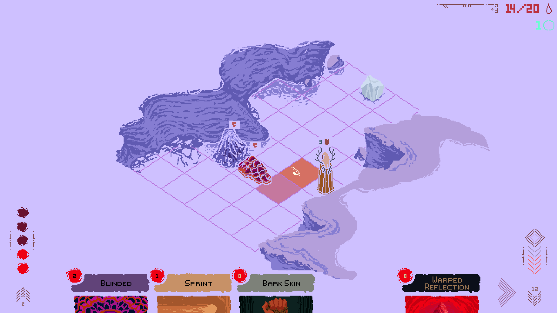 So, you’ve built a deck, spent some Death Howls and gotten yourself into combat. In combat you’re on a grid, often an uneven one. This allows you to space and block enemies more effectively, which is important because they can hit hard. Enemies have a move value and a few attack options depending on their range, as you’d expect. However, Death Howl also innovates a novel mechanic whereby an enemy at exactly the right range will perform a “Powerful” attack. This changes based on the enemy. For example the floating shark head spirits can charge and pierce you, ending in the space behind you. However, if you are against a wall, they cannot perform that powerful attack as there’s no space behind you. By carefully positioning yourself and controlling enemies you can avoid these powerful attacks and increase your longevity.