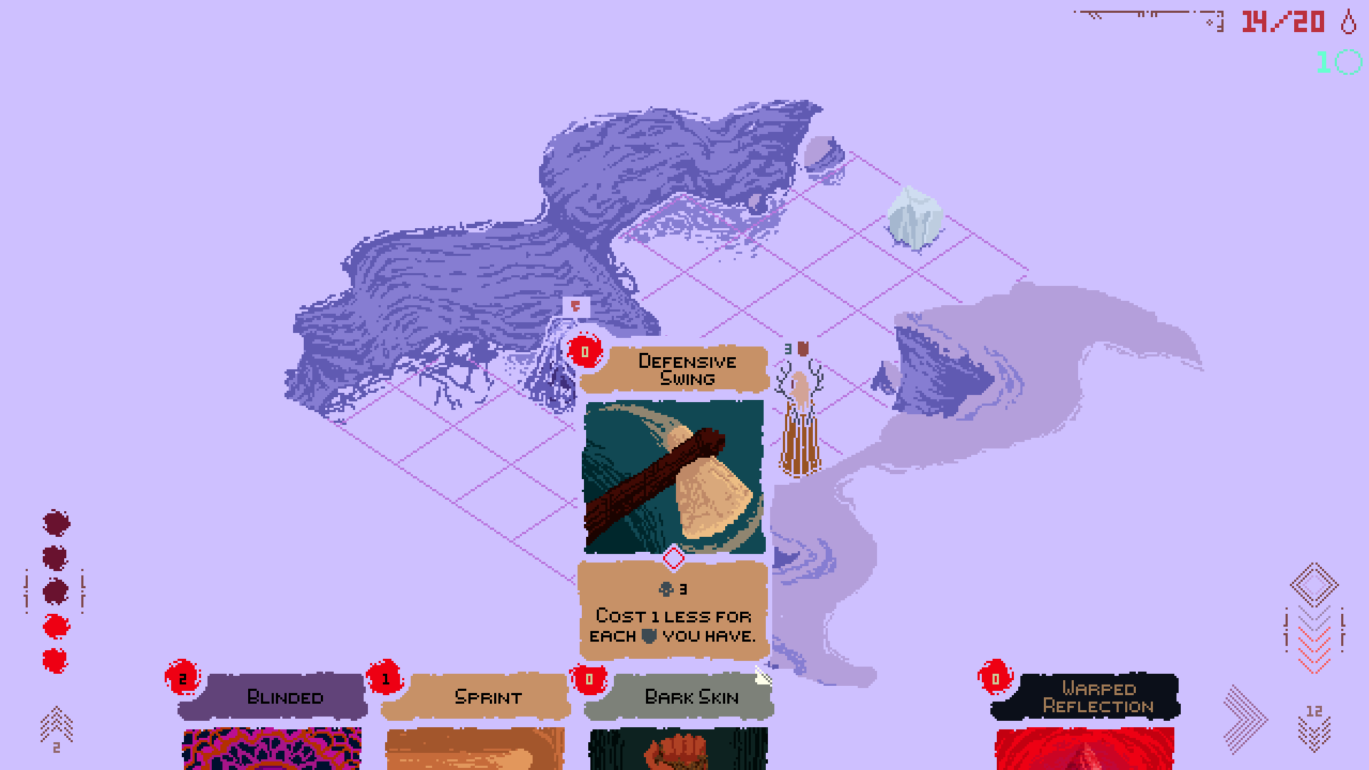 To control the battle you have Mana. These action points are used for movement and playing cards. Each tile of movement is one Mana. Cards have a cost associated, and many can be modified based on the Realm theme. For example some cards from the glacial Realm of Piercing Winds become cheaper the more Block you have. Balancing movement, playing cards, changing Mana costs and avoiding powerful attacks creates a tense battlefield where every choice counts. The movement and card playing resource is shared, unlike many games, so cards that move you and attack are incredibly valuable. These cards, such as Shadow Thrust, can provide two spaces of movement to a target and then deal damage all at once. As separate cards that would cost as much as four Mana, instead of just two.