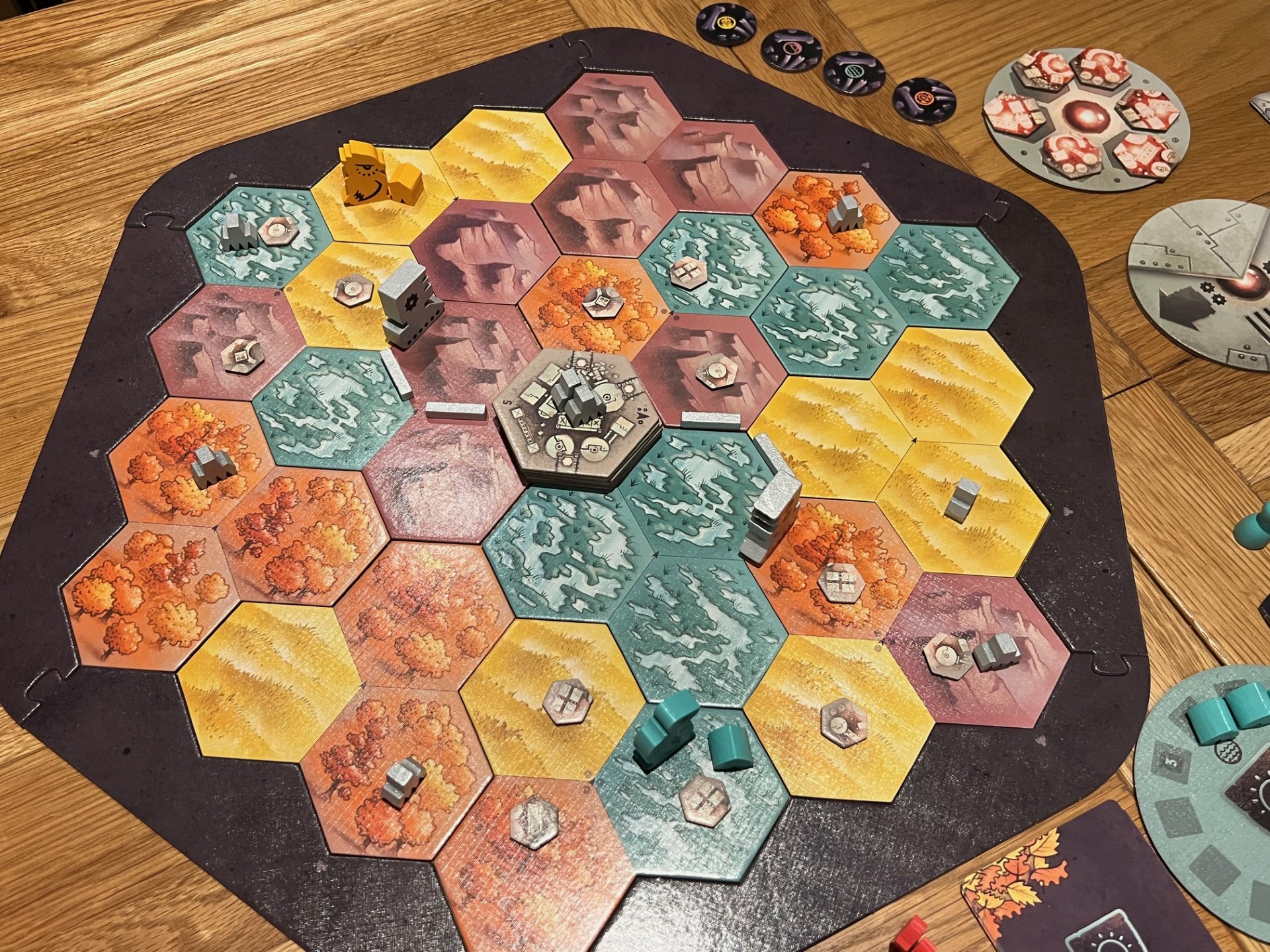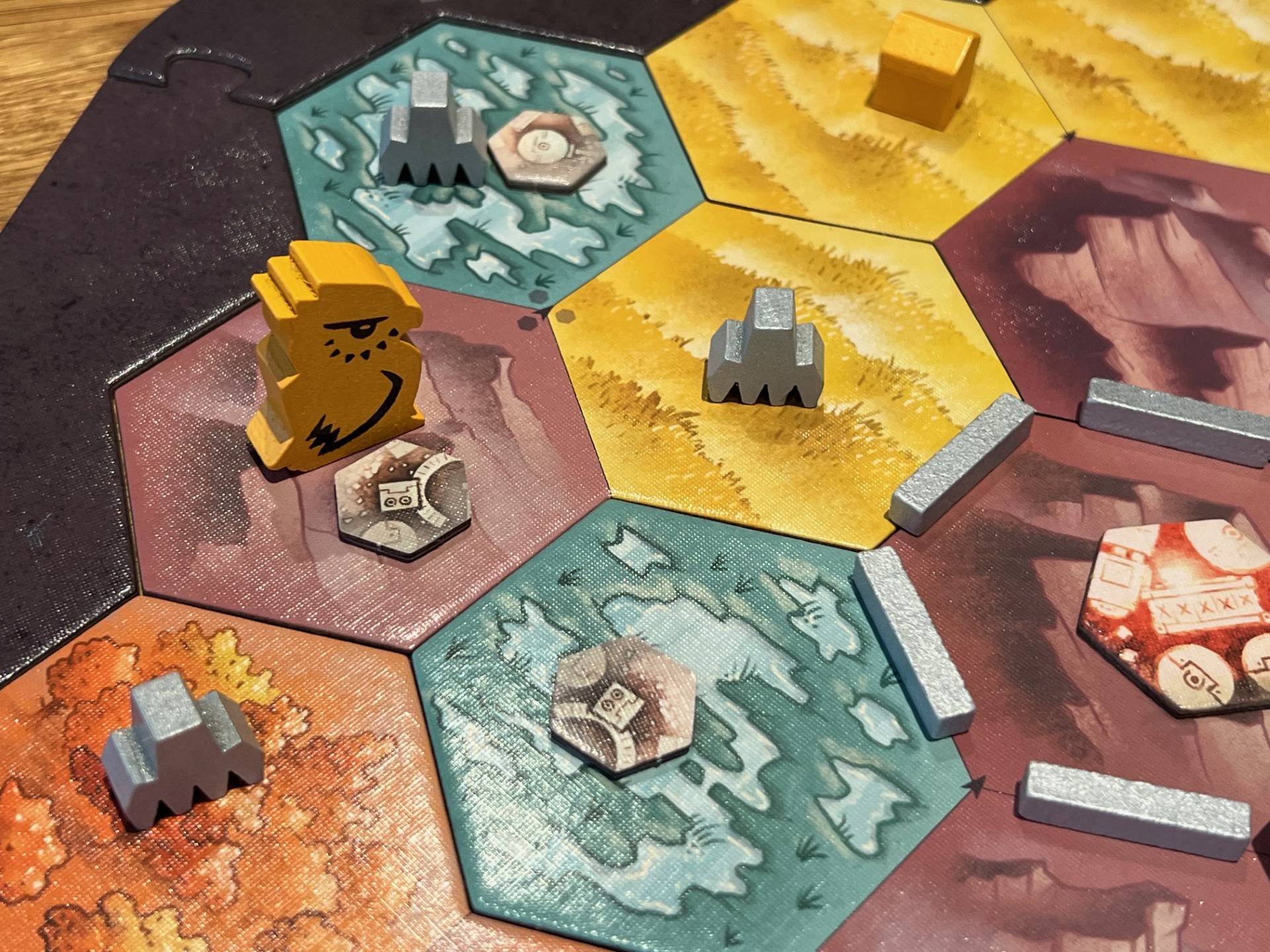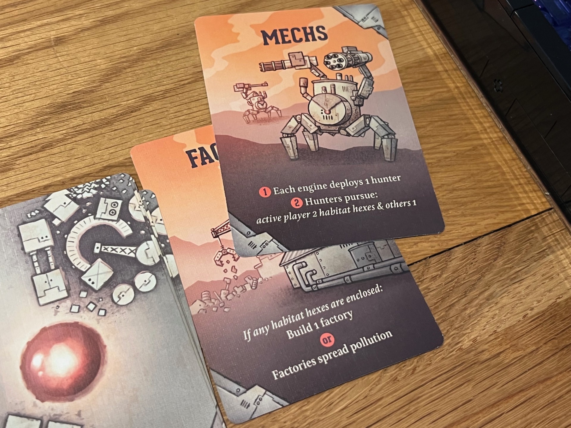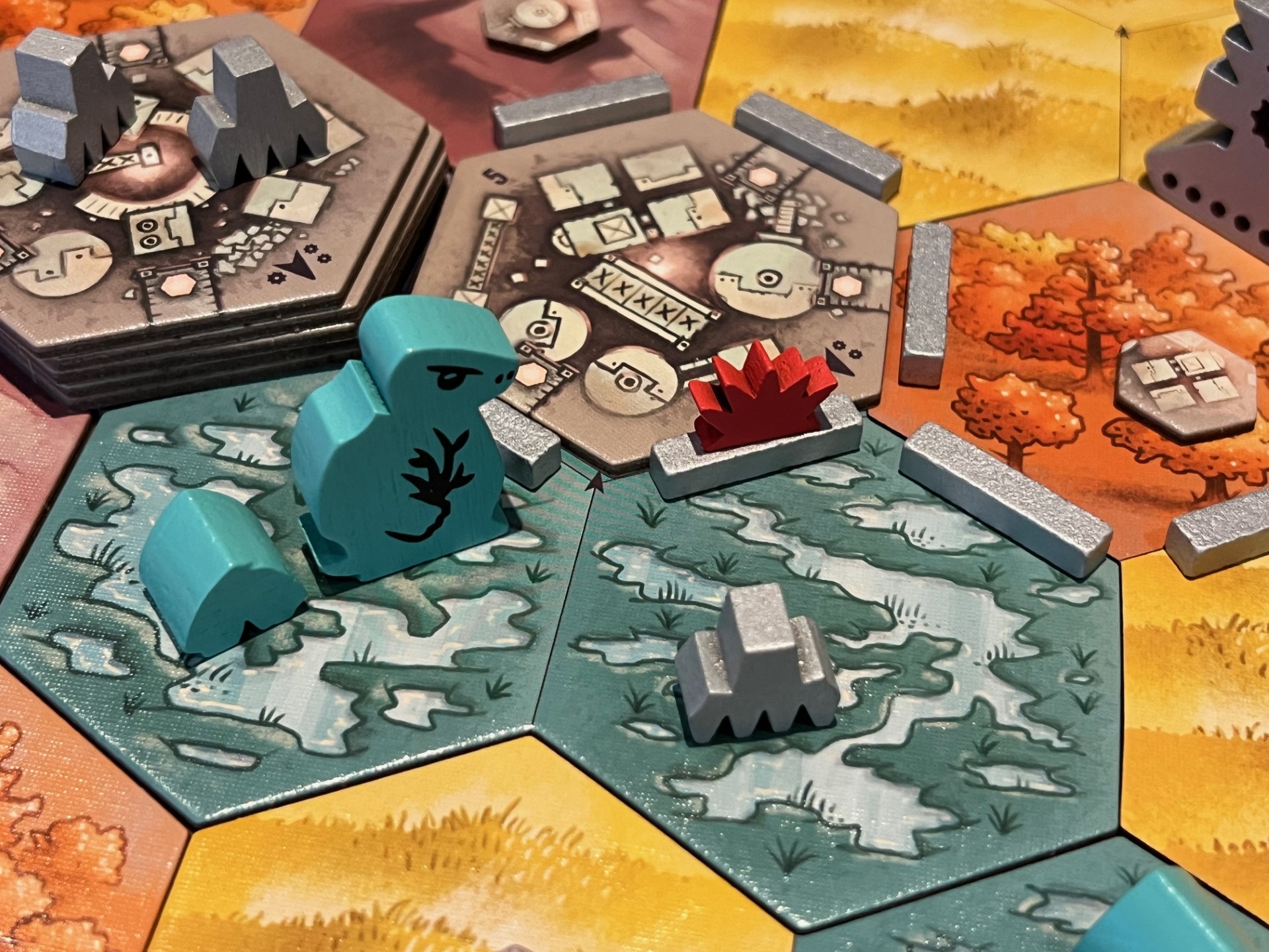 The group is not simply building based on a static board state — it’s firefighting, adapting, and sometimes sacrificing progress in one place to prevent collapse elsewhere. The machines themselves are controlled by a deck of cards that escalate their presence each round. Some cards spawn new structures, others spread pollution, and a few trigger devastating chain reactions that can wipe out entire regions if left unchecked. On almost all turns, the machines sent out into the Wild will chug along the borders of tiles throwing out their metallic silver walls — with a feeling of ominous certainty.
