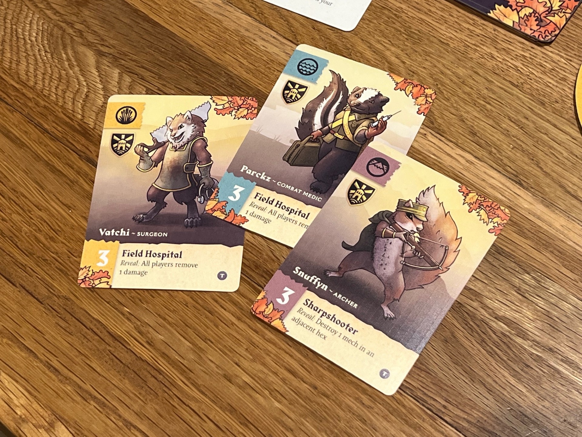 The factions themselves are well-defined, if in practice, purely mechanical. The Sect are aggressive technologists, able to breach walls and destroy factories with ease. The Coven are more mystical, using rituals to cleanse toxic sites and manipulate terrain. The Council and The Order make up a strong selection of middle-of-the-road characters, with healing, defensive abilities and strong but straightforward offense. Each card represents a single Defender (of the Wild) with a name and a preferred habitat matching their faction. These Defenders can be “killed” if the player takes three damage, causing a card to be removed at random from your hand.