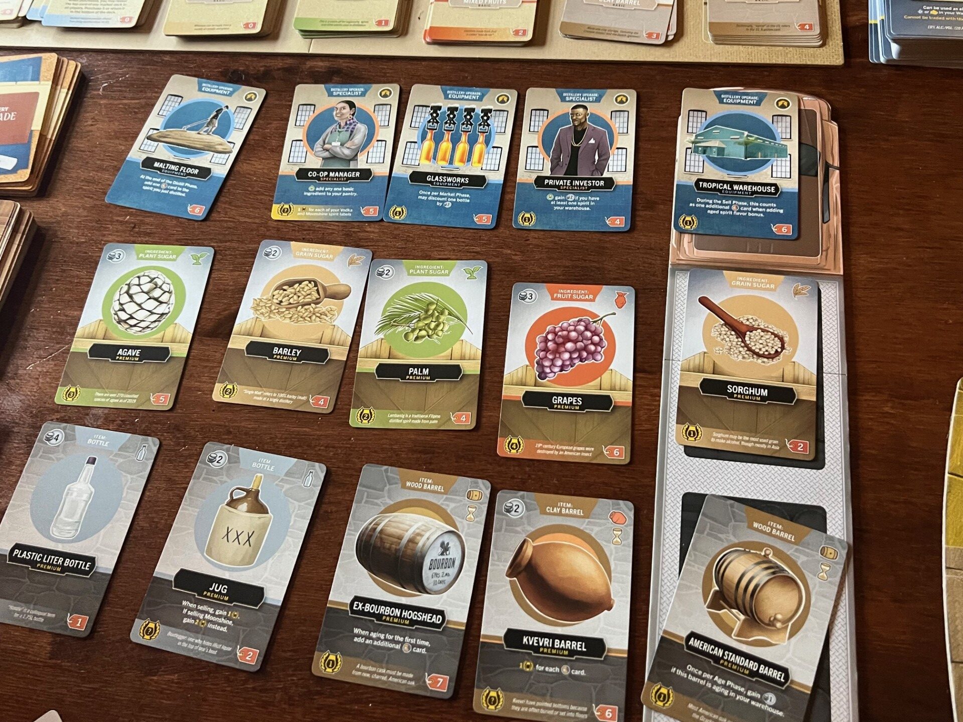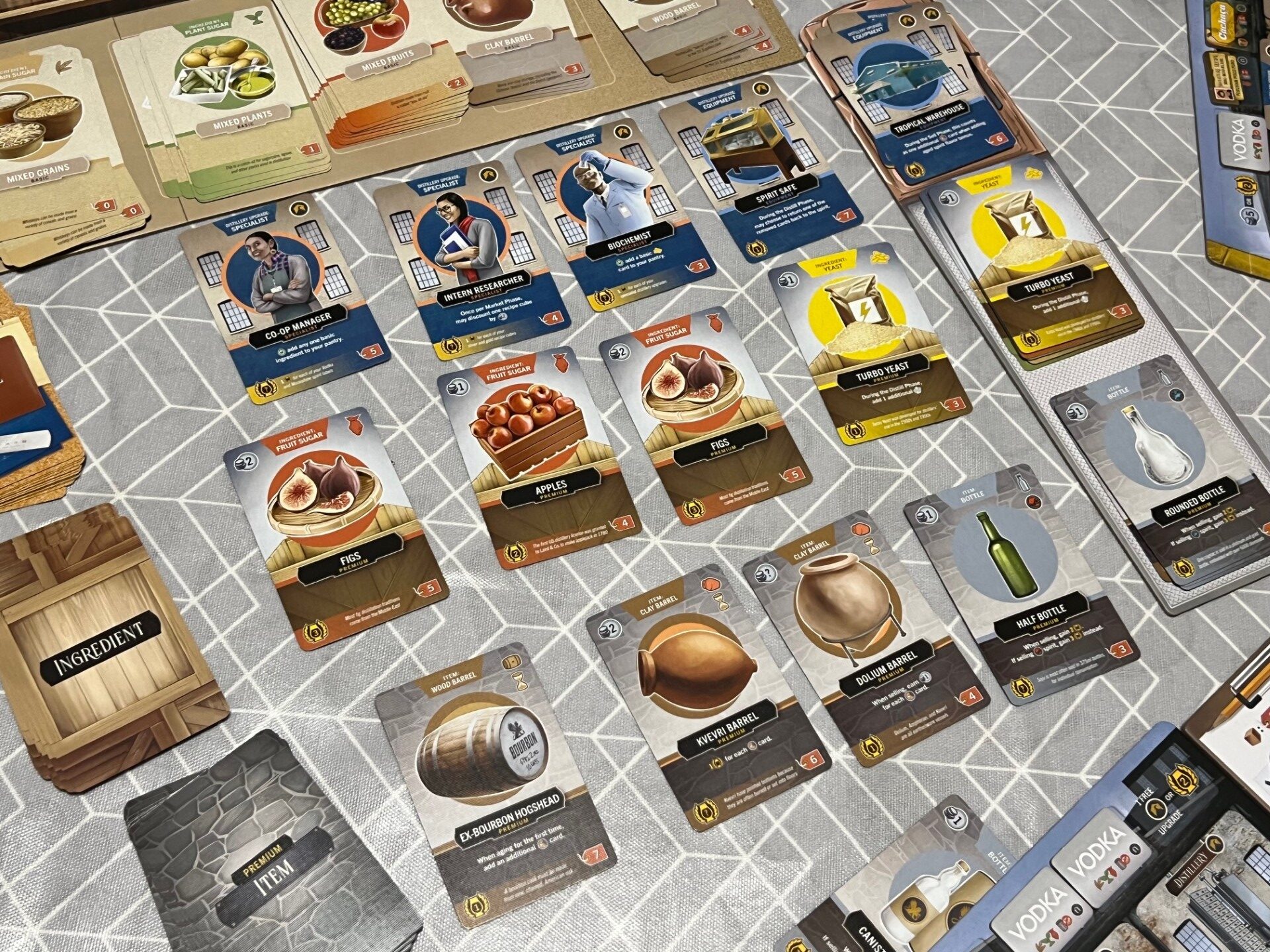 In the premium market, players can access distillery upgrades (which might generate free resources or income, or create end game points), premium ingredients (which include better, more refined types of grain, plant and fruit sugar) and premium items, which include bottles (used in set collection) and upgraded barrels.