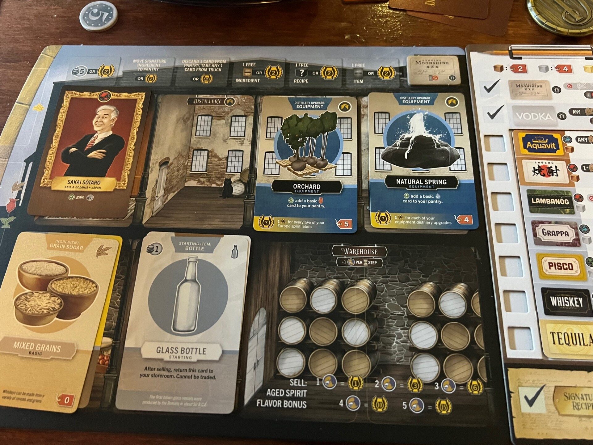 Whatever you make, you will now take a spirit label for it (if there is one remaining) and cover a space on your player board to take a bonus. During the early game, I like taking a free distillery upgrade, but you will also need to use one of these bonus spaces to take your unique ingredient (which means you can make your signature spirit.) If you’re going to age your spirit, this is the moment where you’ll choose a barrel for it, which is placed on top of the stack and into your warehouse ready for ageing. Again, if you don’t have the correct barrel, you can’t make whisky (or any aged spirit) so you’ll have to drop down to Aquavit, Vodka or whatever.